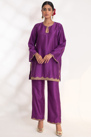 • A Purple short kurta set paired with straight pants, embellished with intricate antique gold zardozi embroidery.