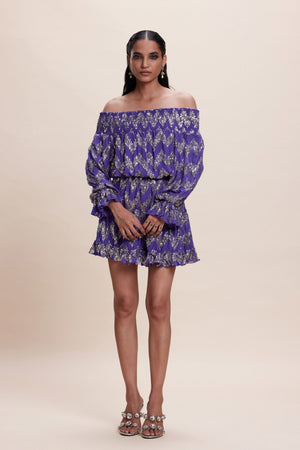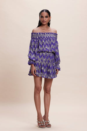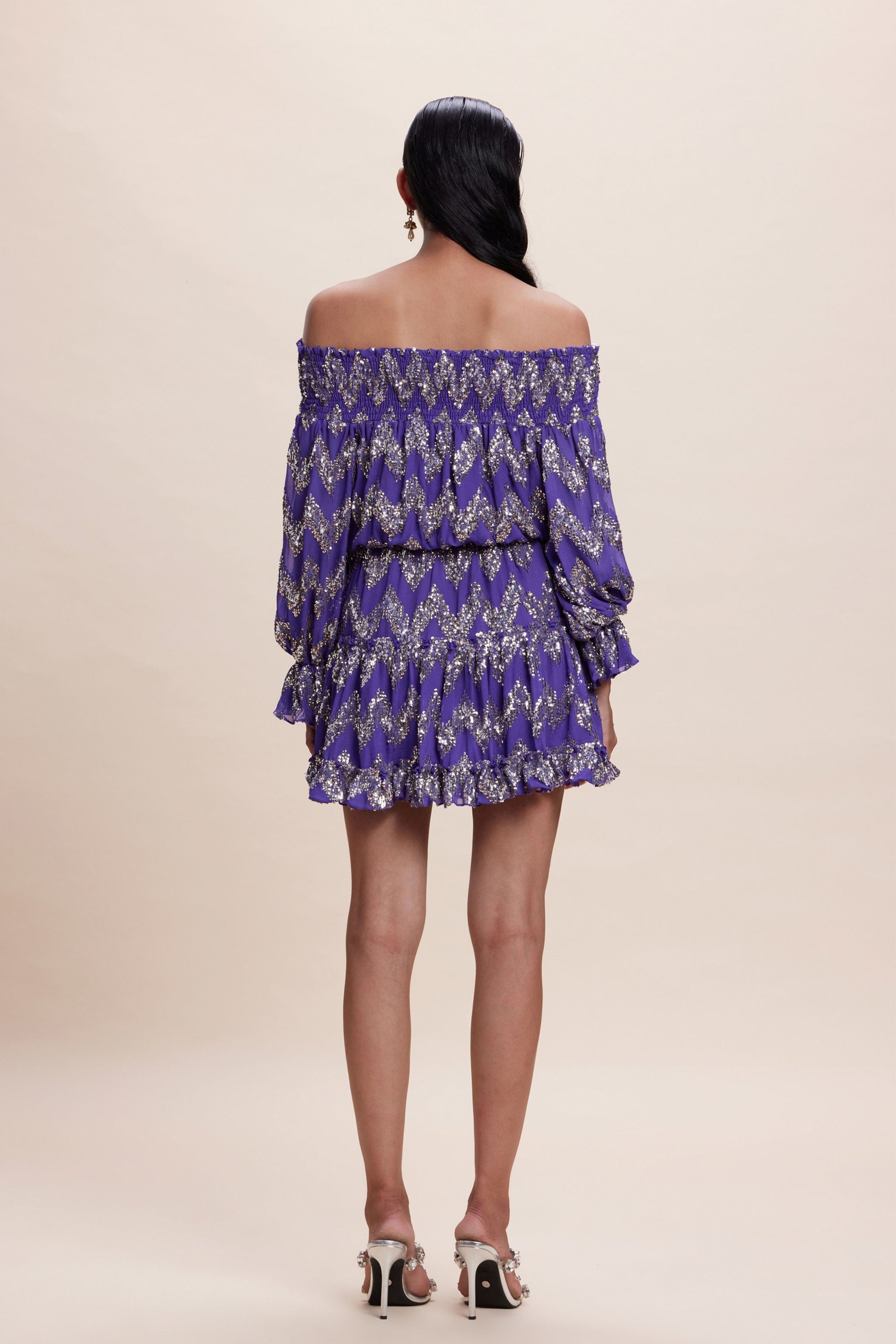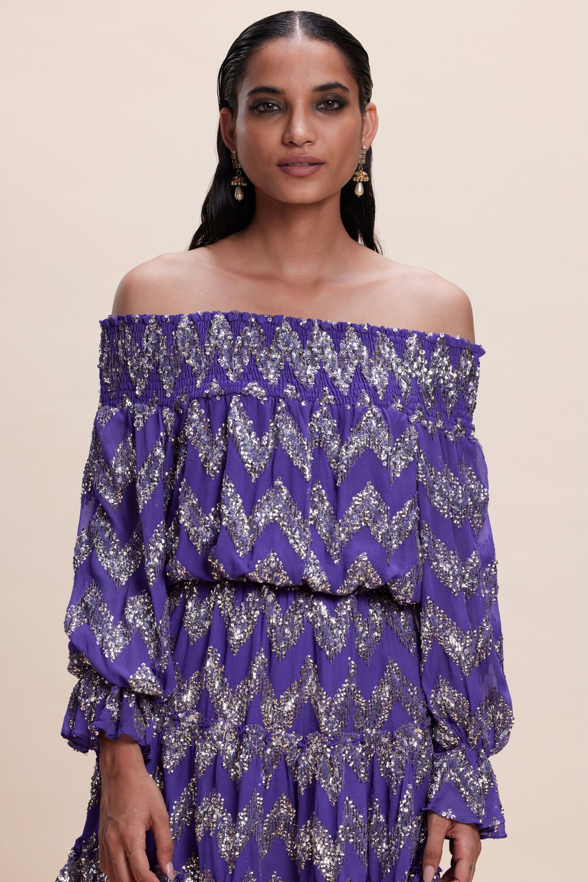 • Stand out in our purple off-shoulder dress with chevron sequins, combining sophisticated style with dazzling sparkle
