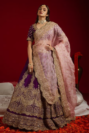 • This purplish wine colored dupion lahenga has rich look. Decorated with blend of machine and hand golden heavy embroidery. The blouse has a deep neck line with golden neck and sleeve detailing embroidery with allover buti.