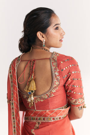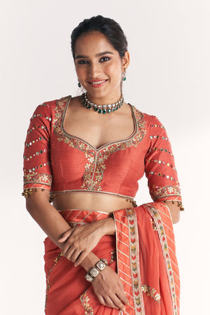 • Rimjhim tangerine organza saree is a statement piece with its floral and gottawork. The blouse brings festive vibe with the intricate and delicate floral and mirror work, the sleeves has tassel like trims which elevates the freshness.