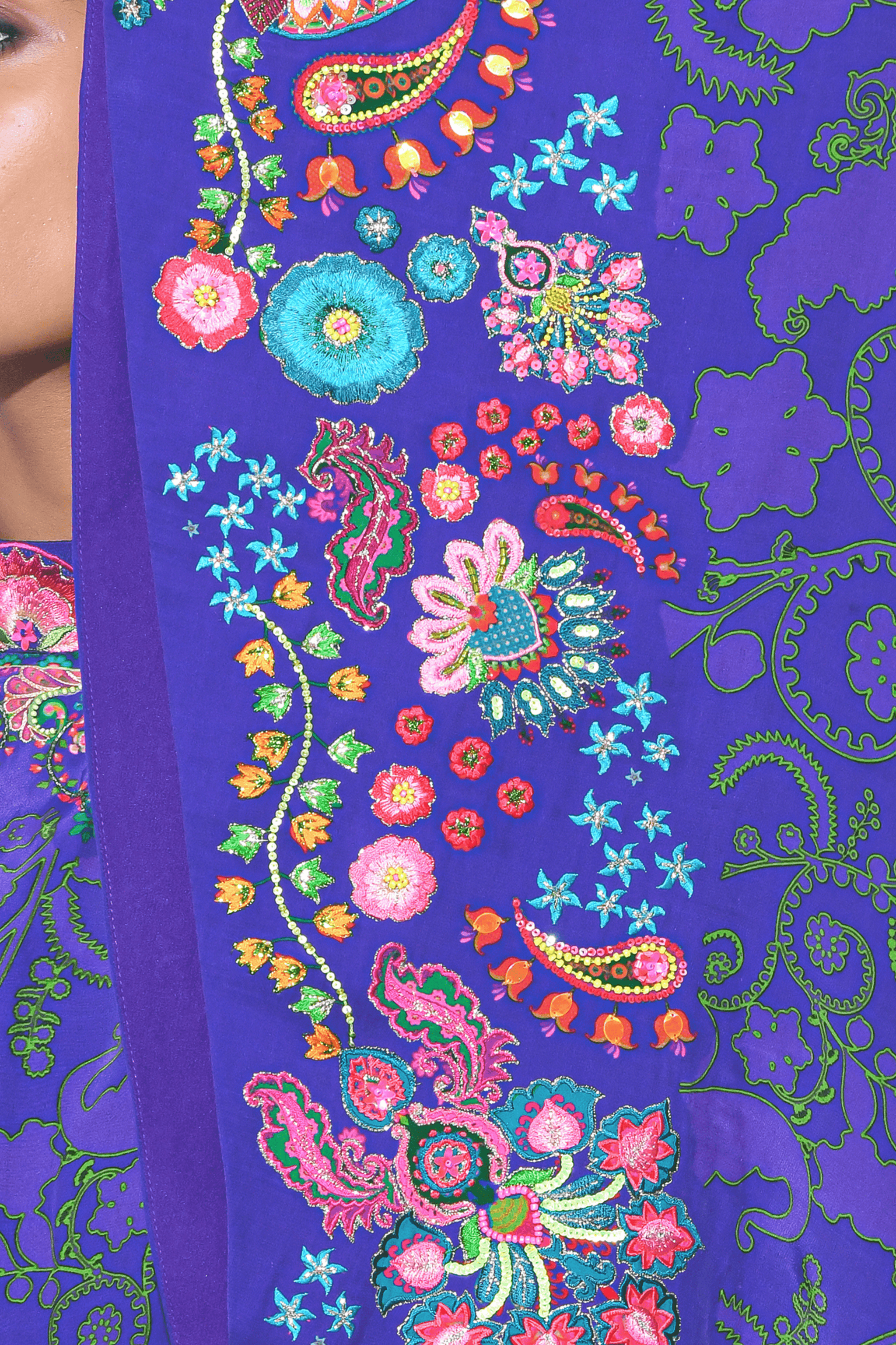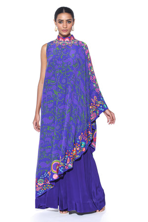 • Royal purple self sb signature royal paisly print and heavy hand embroidered border one shoulder cape dress paired with aurora purple inverted box pleate, wide leg jumpsuit.
