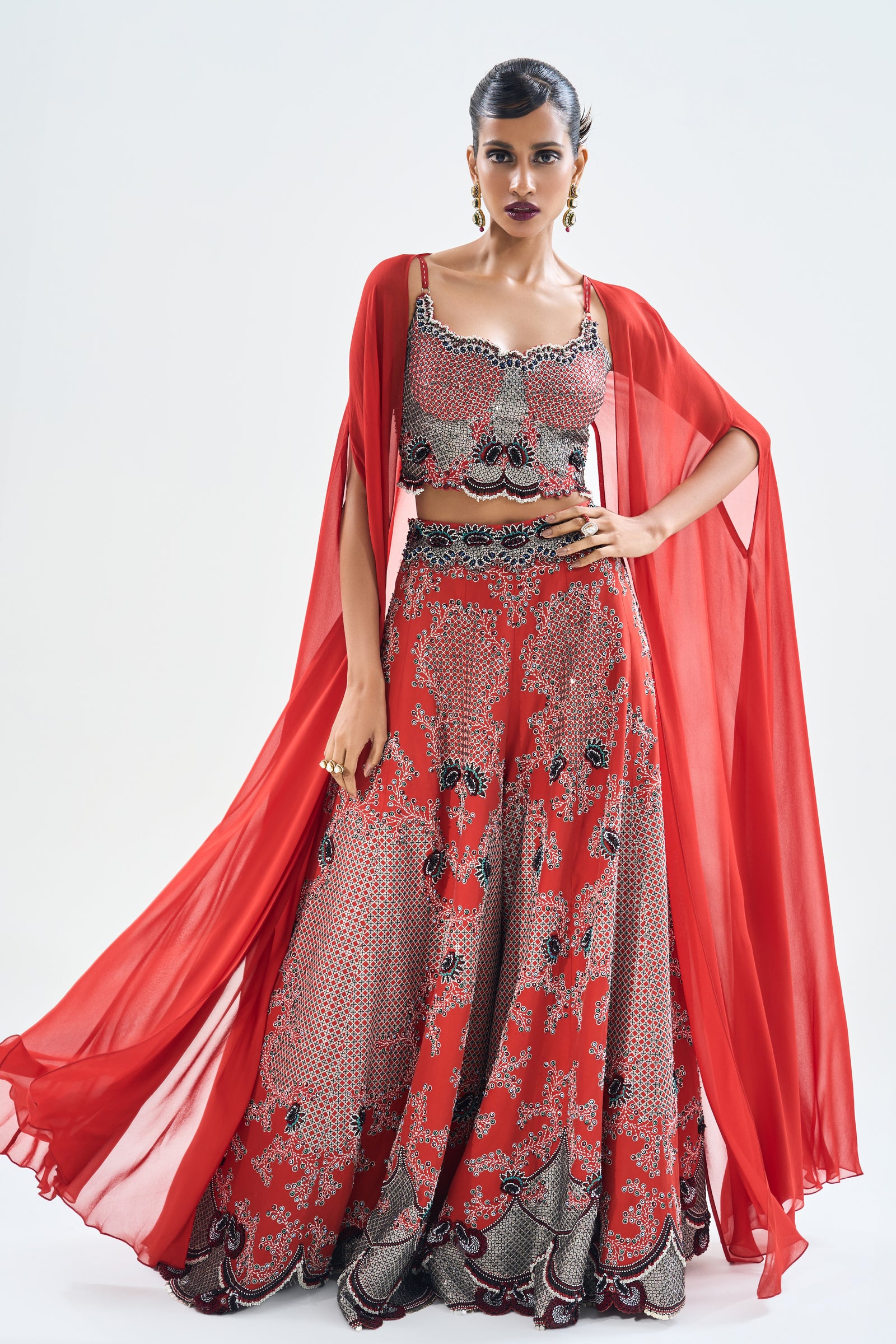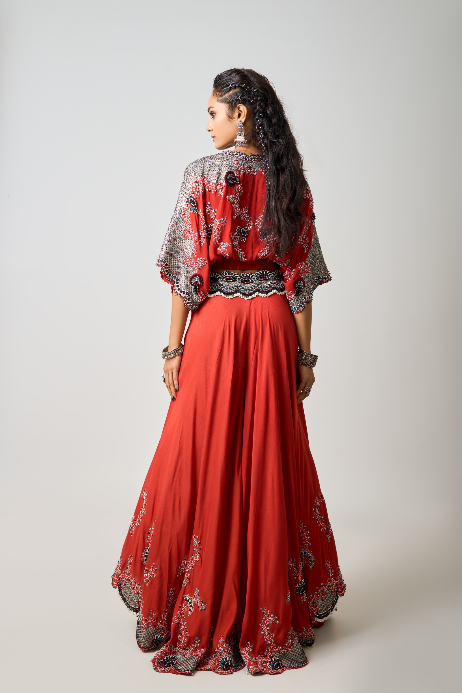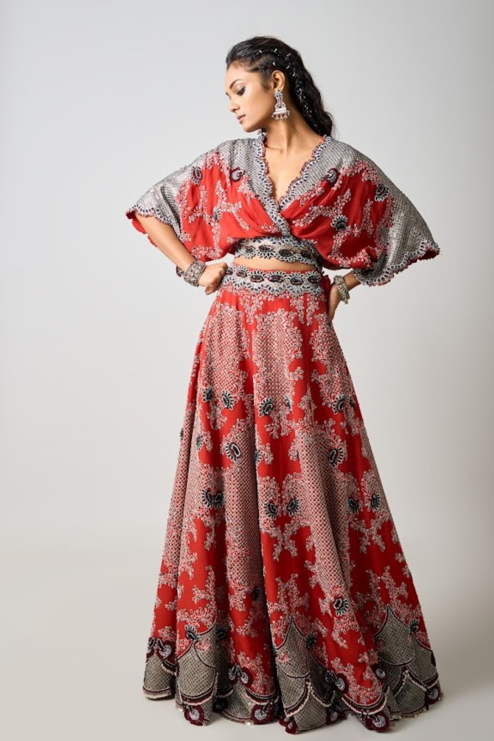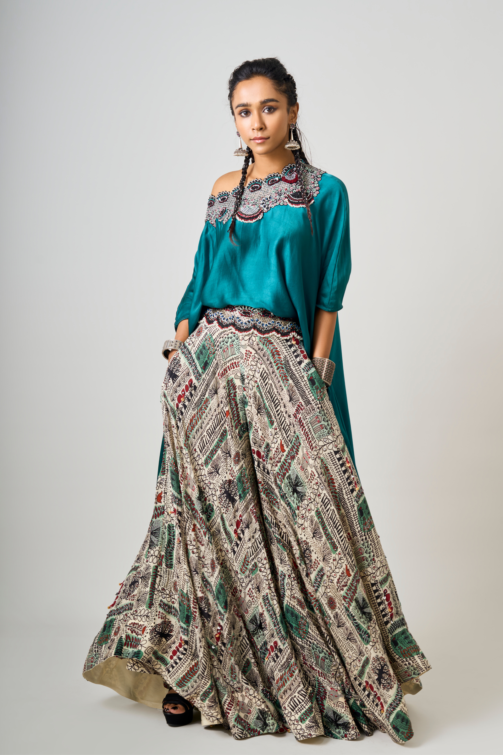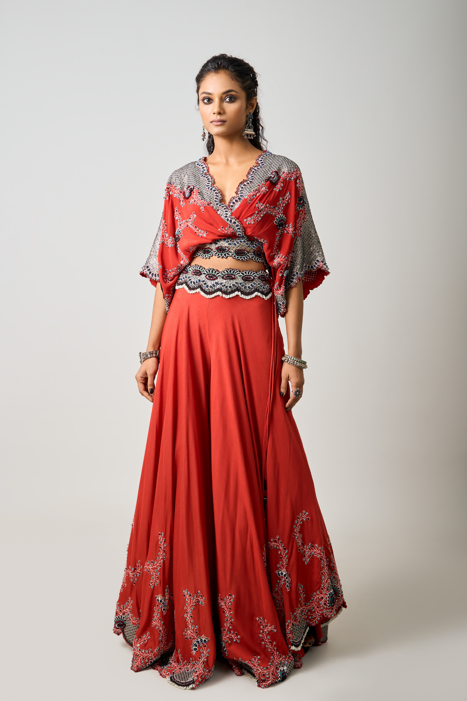 • Rust orange hand embroidered singlet with mint printed & hand embroidered lehenga