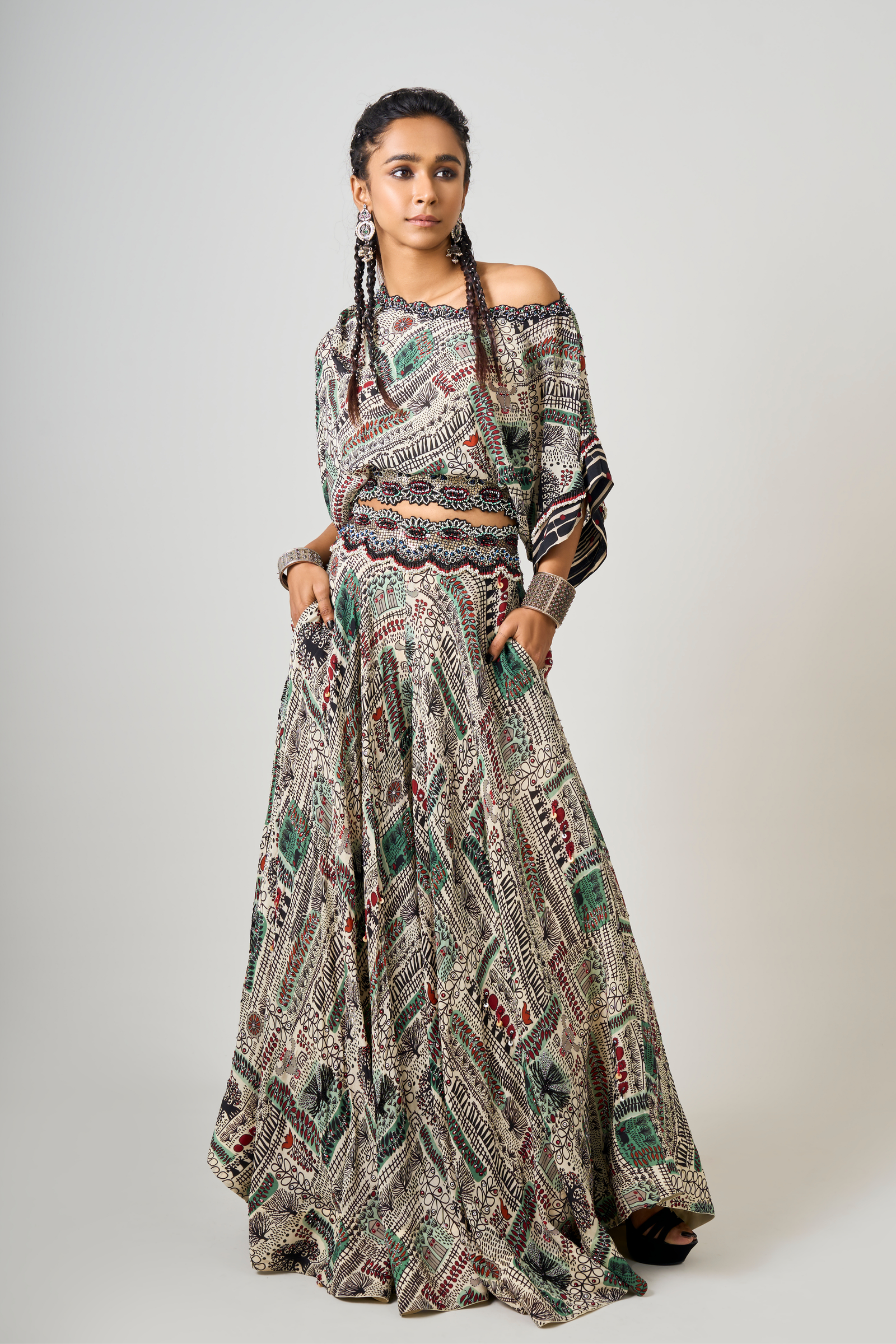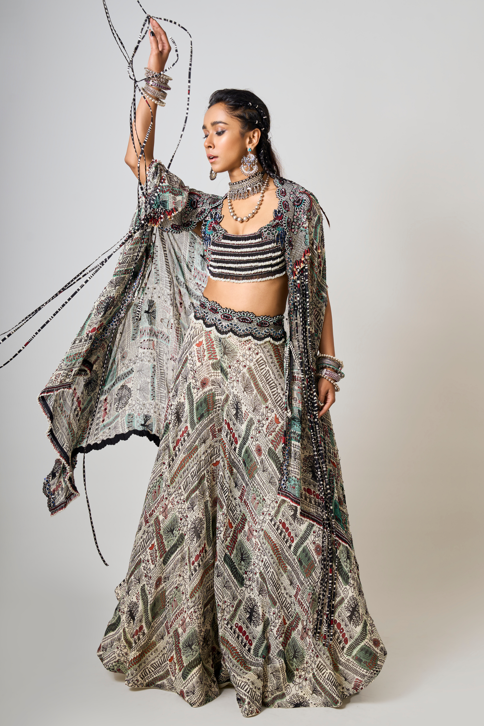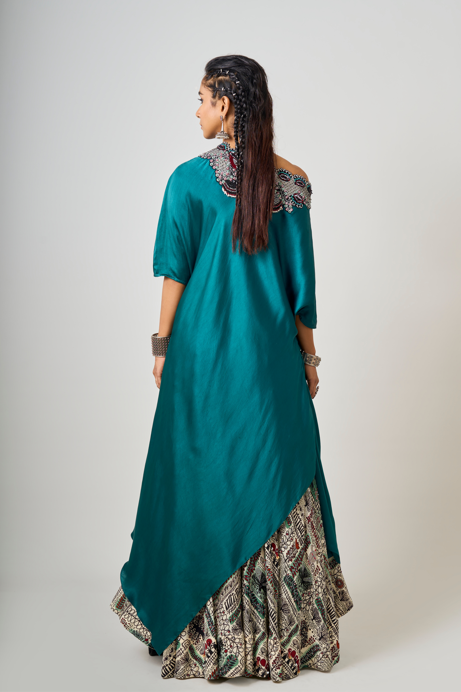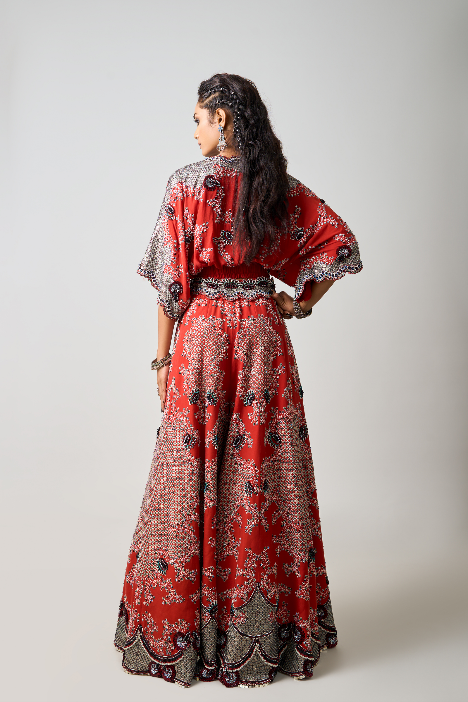 • Rust orange hand embroidered singlet with mint printed & hand embroidered lehenga