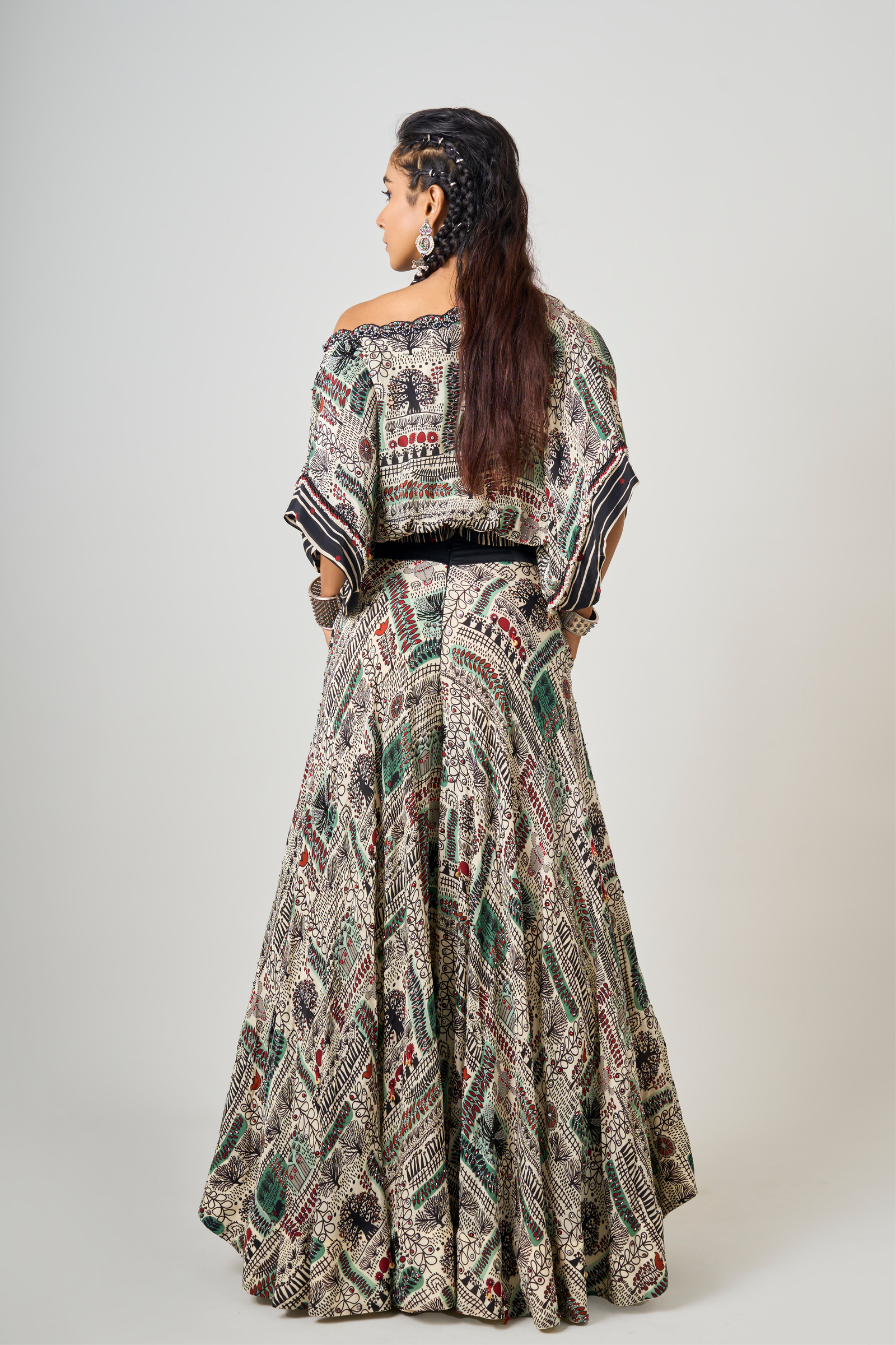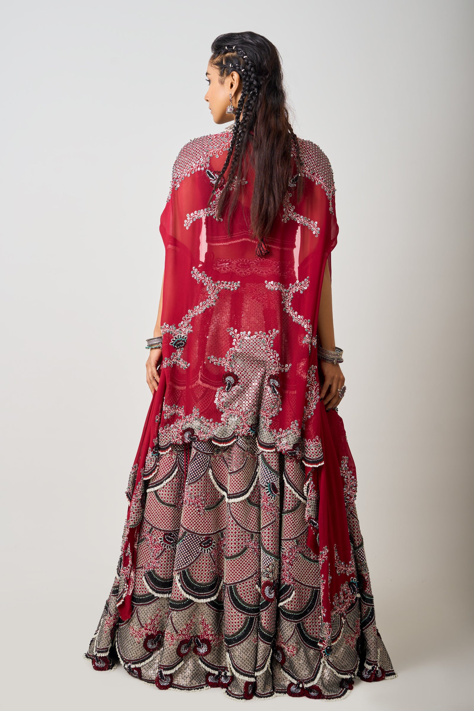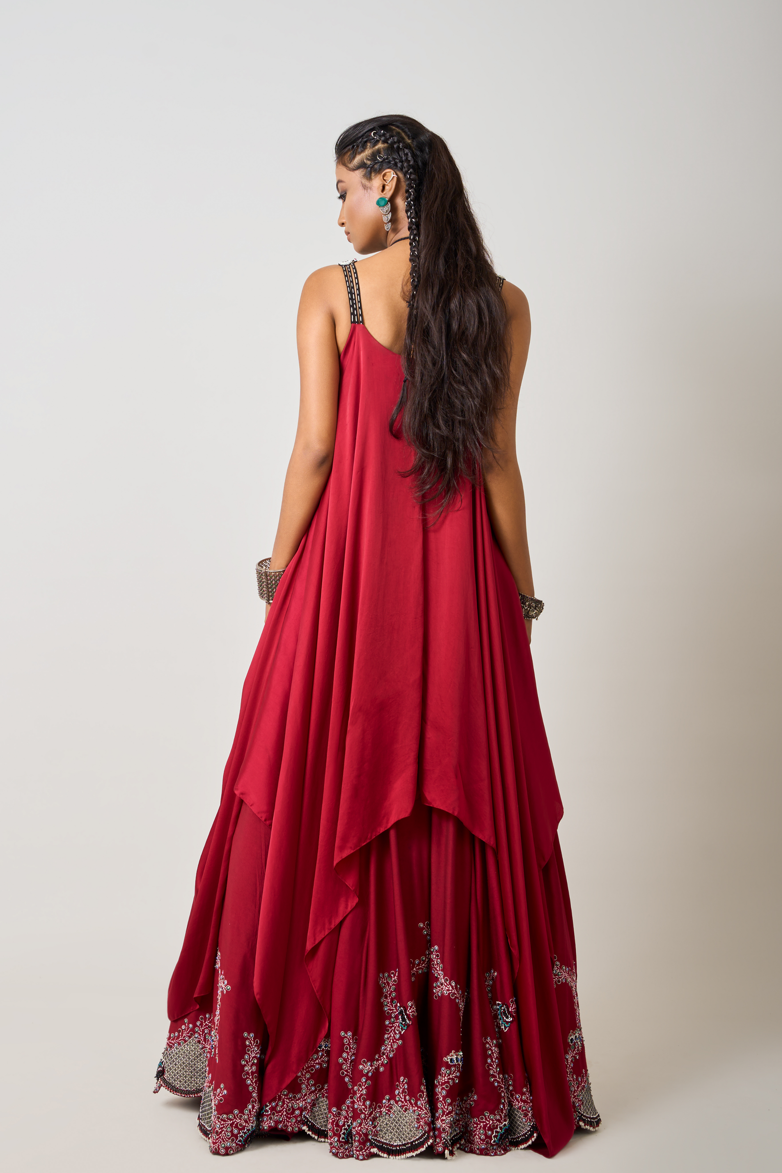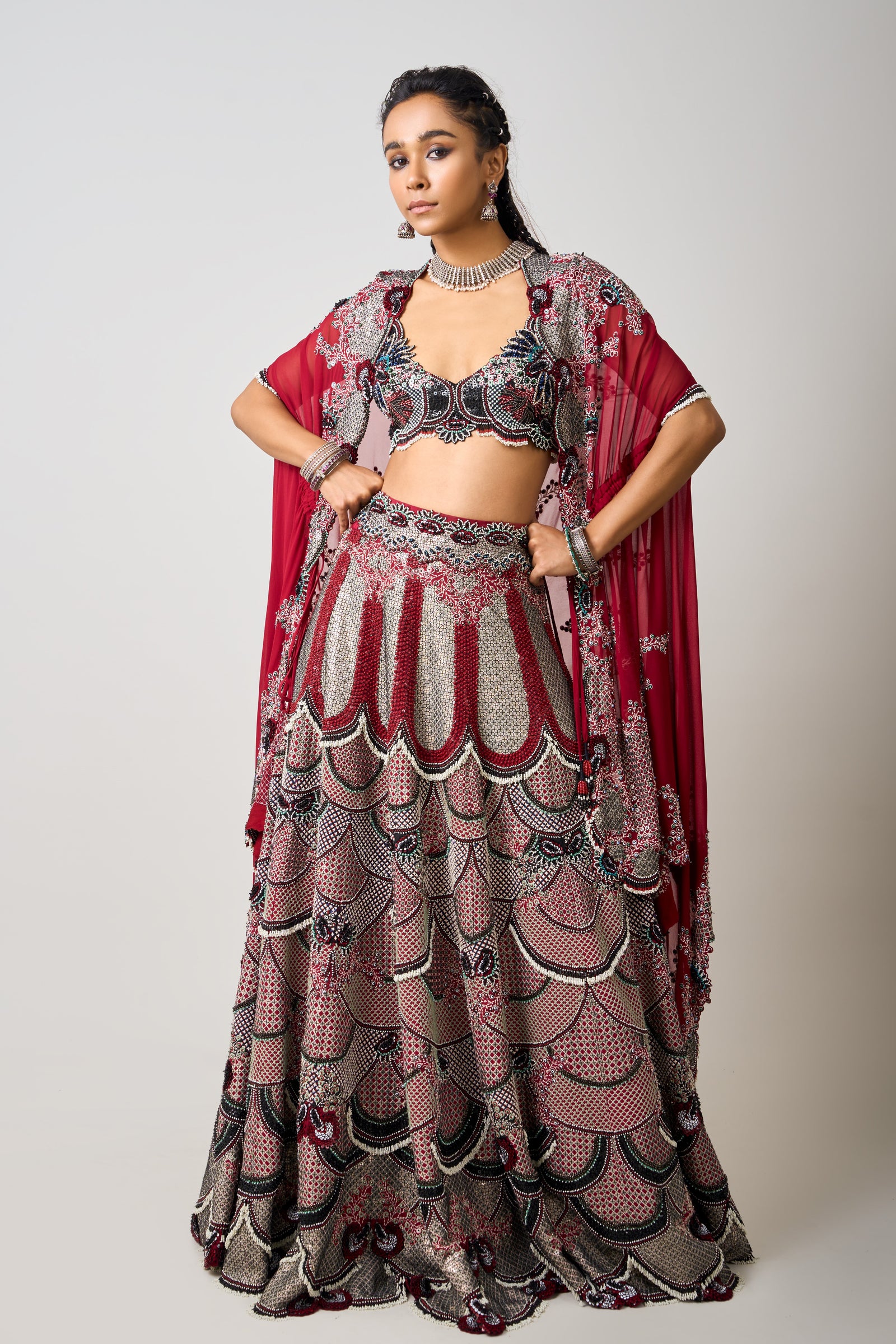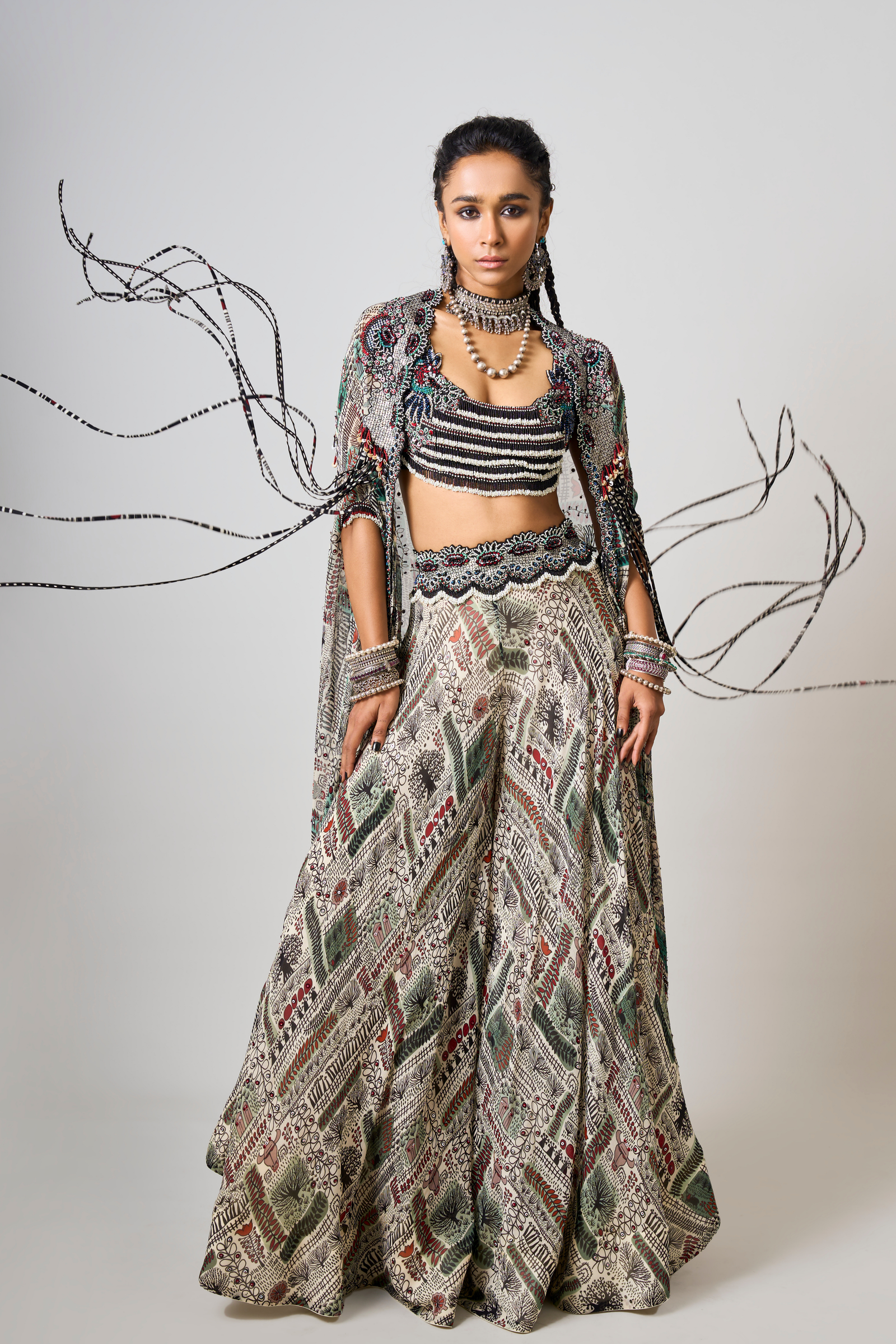 • Rust orange hand embroidered singlet with mint printed & hand embroidered lehenga
