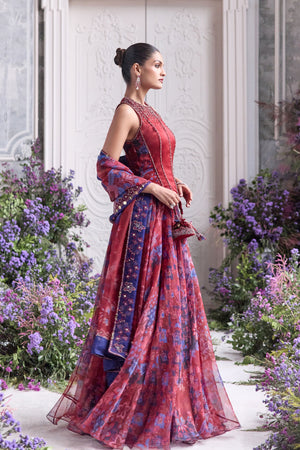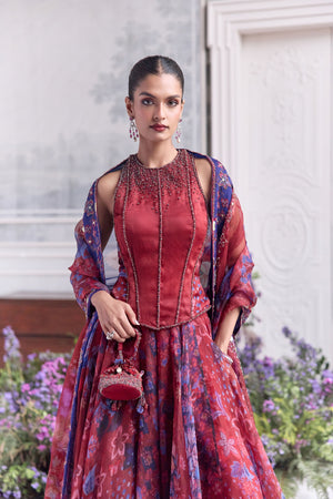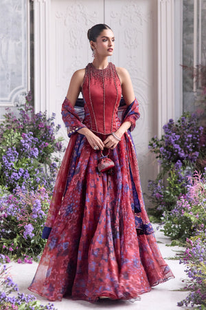 • Racerback corset top paired with embroidered dupatta and floral lehenga