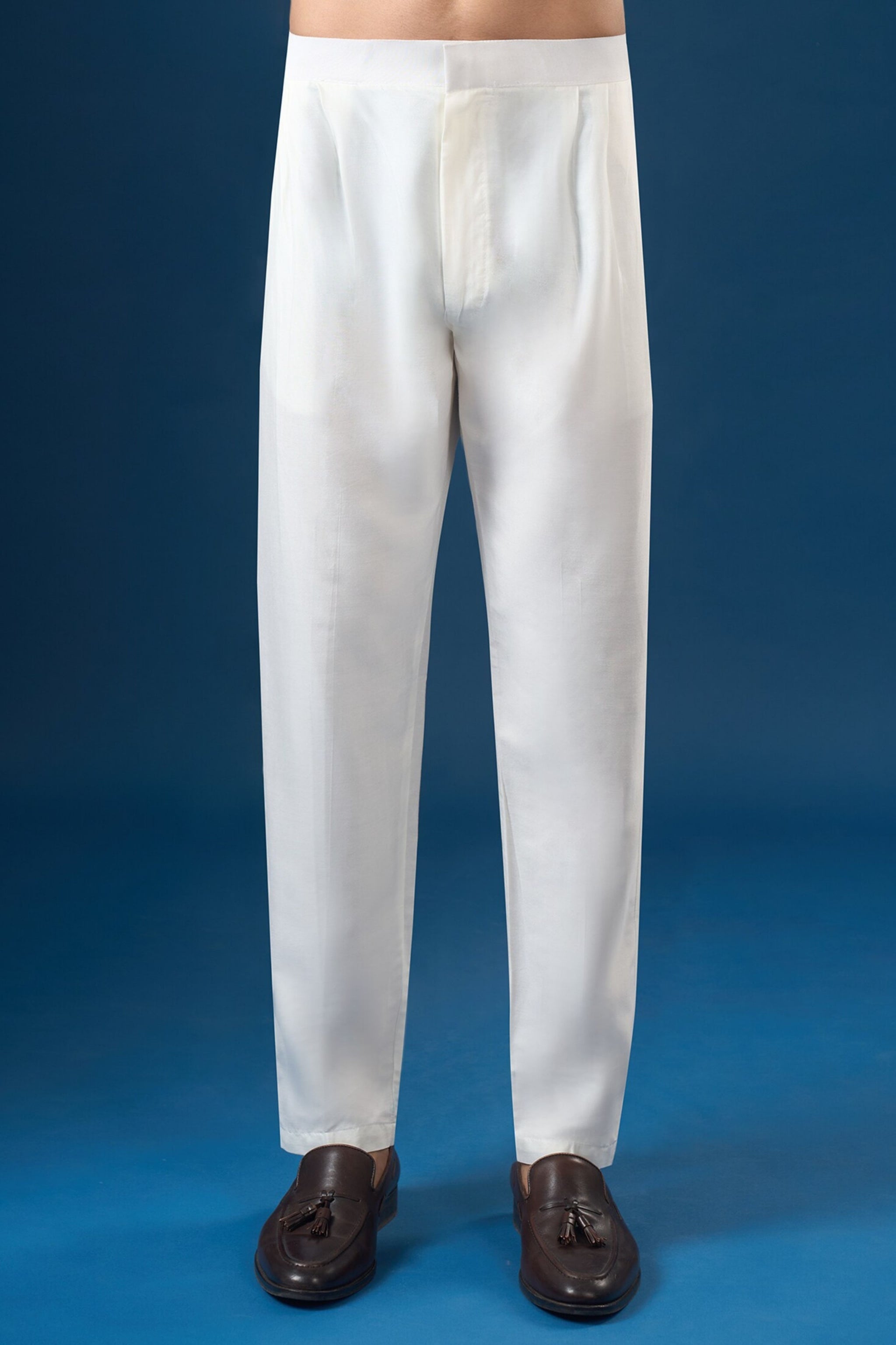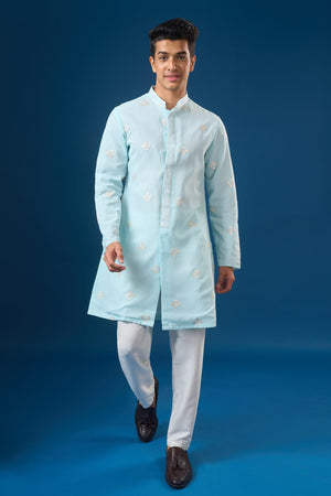 • Sea blue georgette based kurta enhanced with thread and sequins embroidery paired with an off white dupion silk based mexican pants.