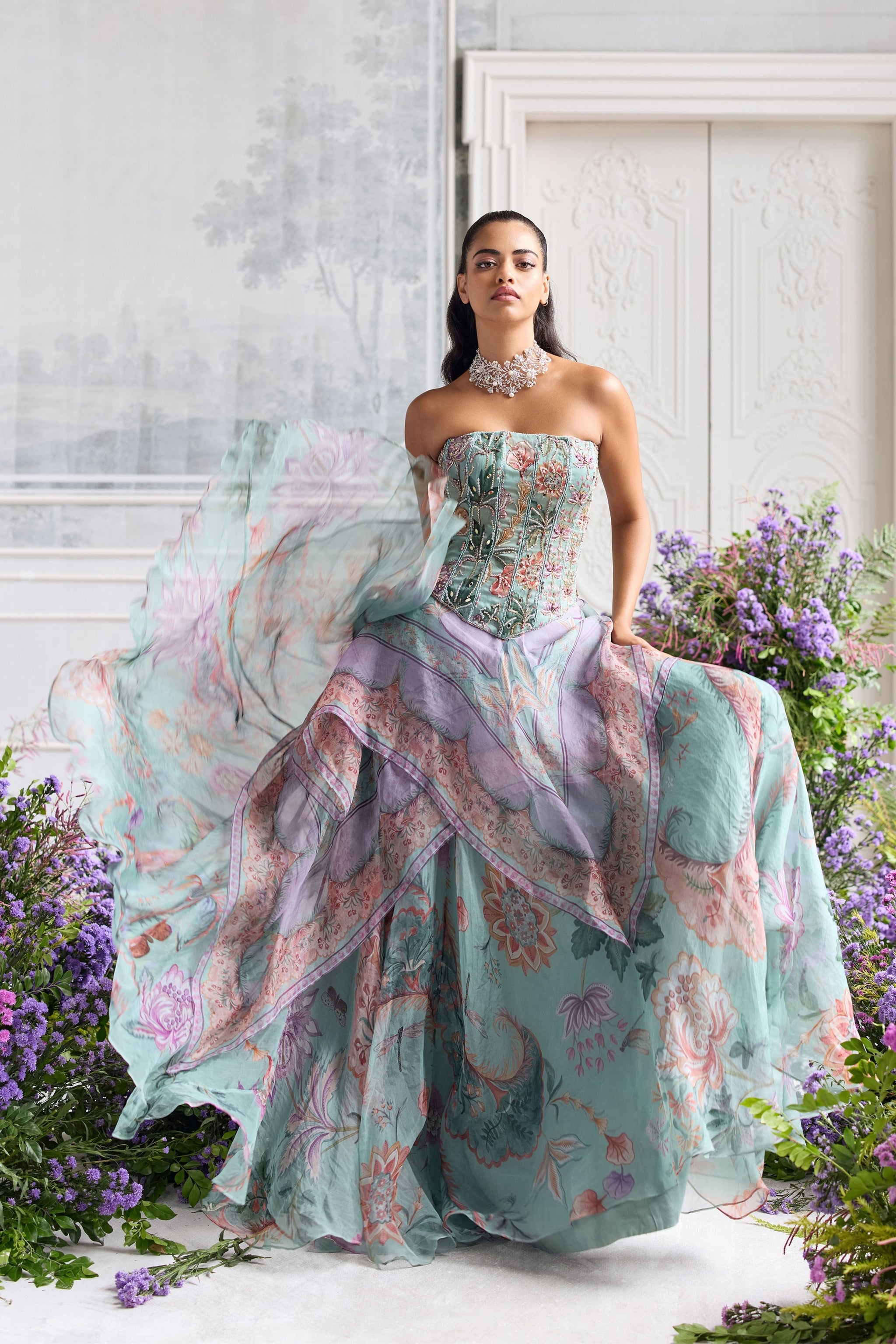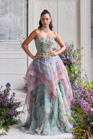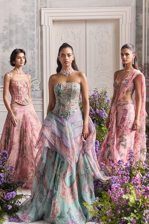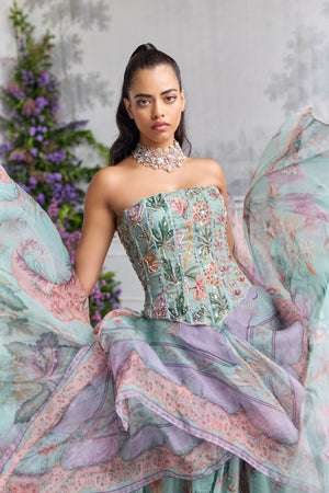 • Hand embroidered corset top paired with floral asymmetrical skirt