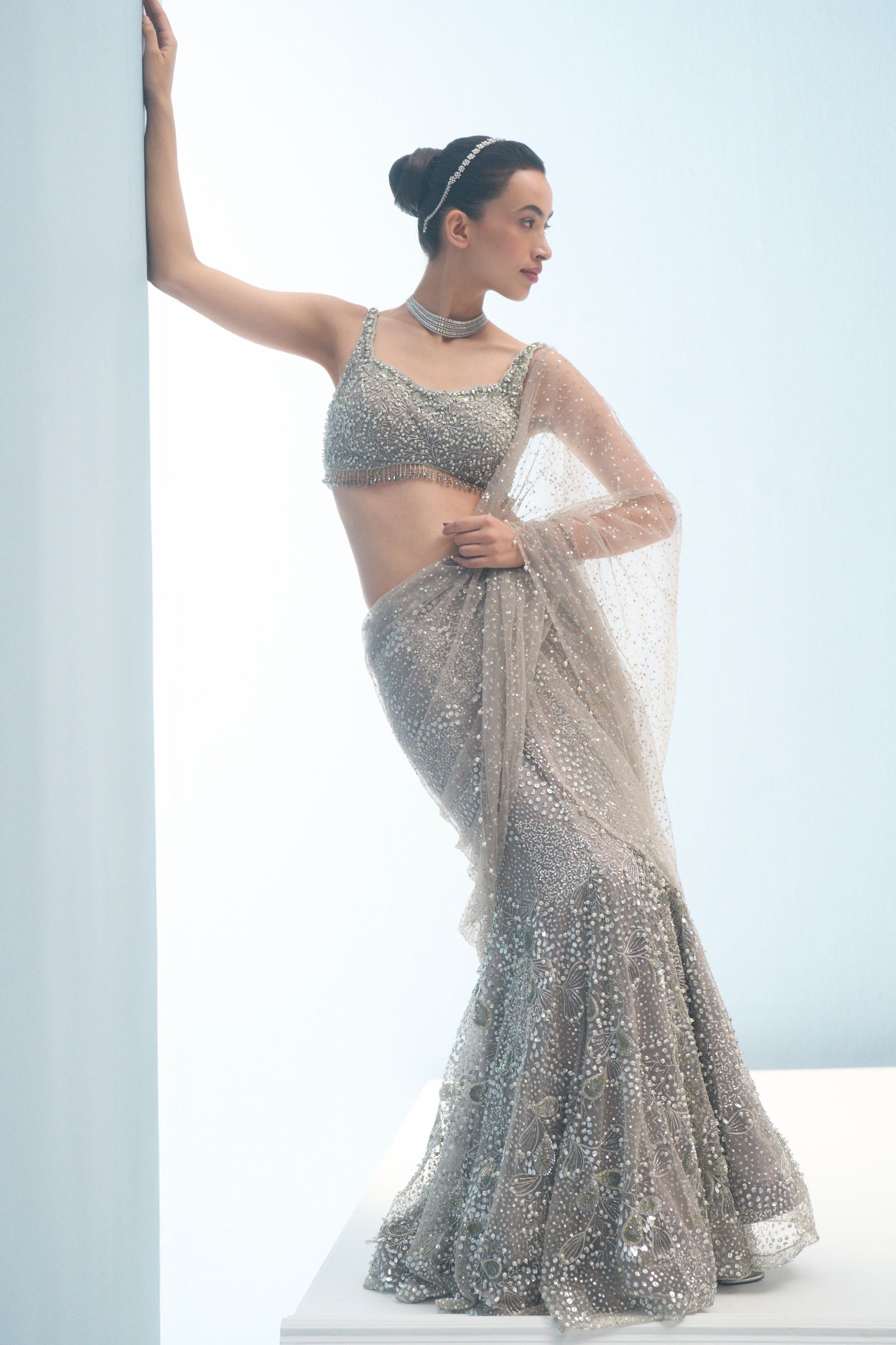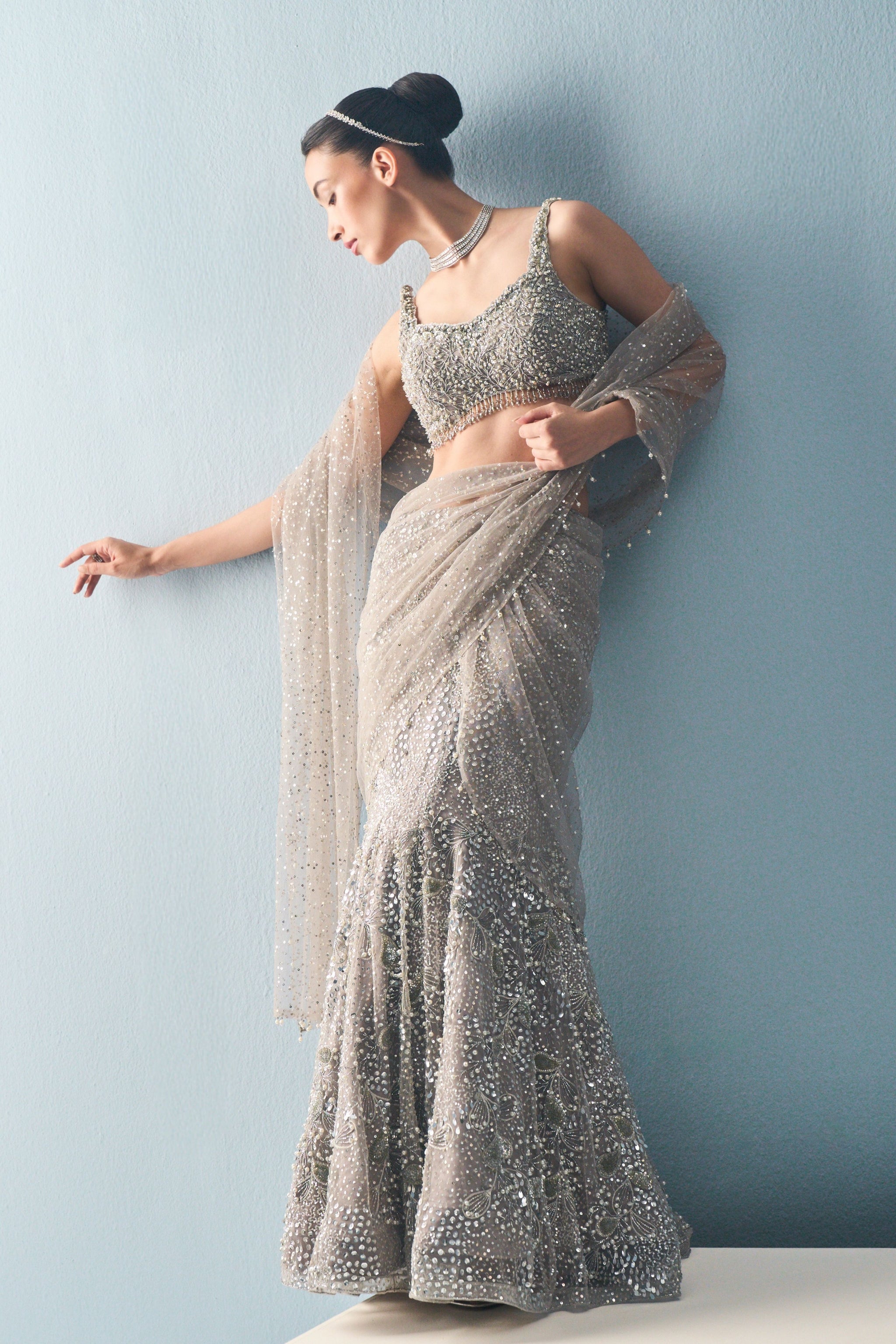 • Silver grey tulle drape lehenga set with an attached drape dupatta and sleeveless blouse .The embroidery used in this lovely set has sequin, beads, cutdana, pearls, resham and stone