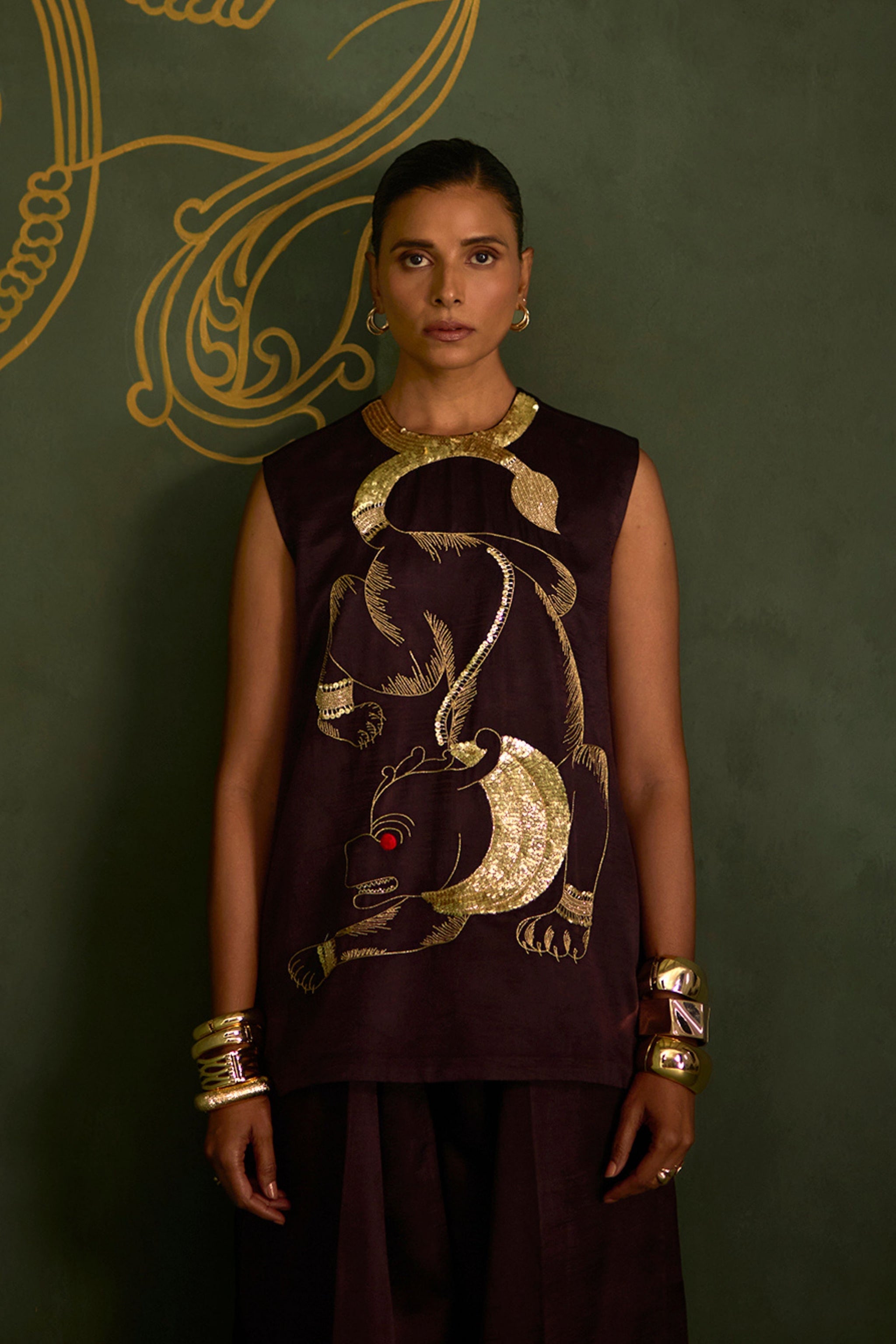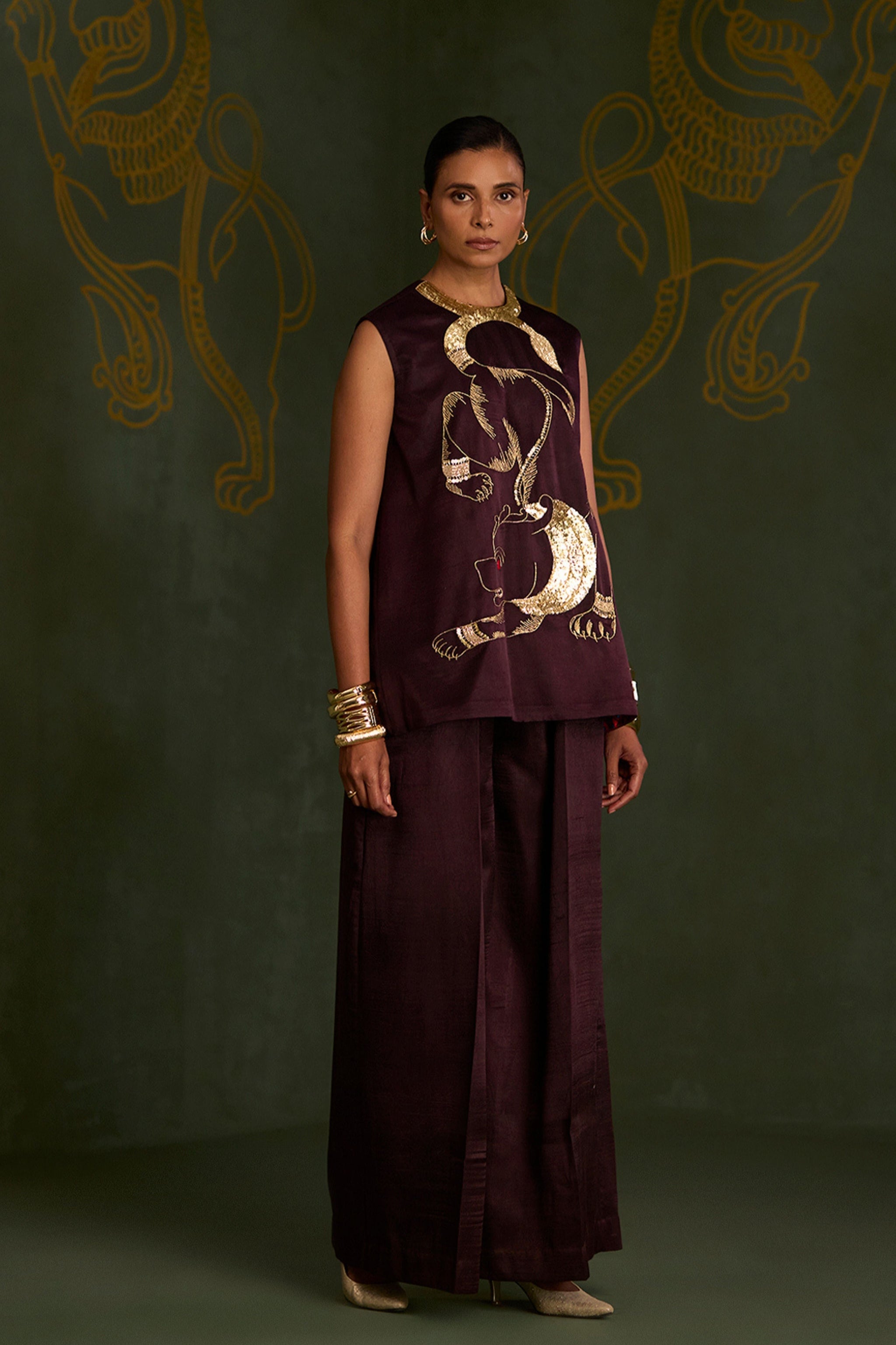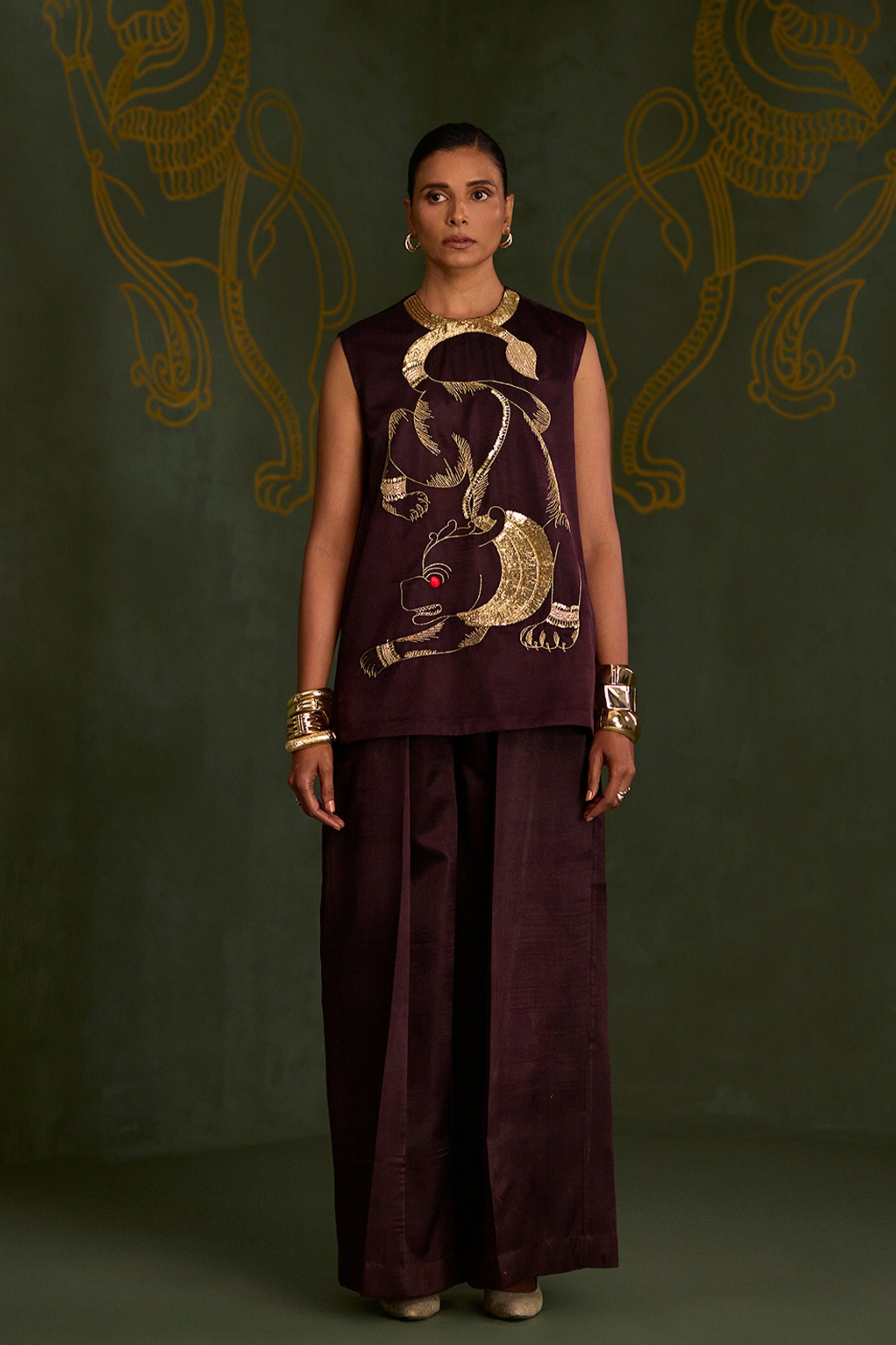 • Elevate your style with this rich gajji silk top, featuring a bold hand-embroidered yali motif-symbolizing strength and grace. Crafted with intricate dabka, naqshi, and sequin work, the sleeveless kurta pairs effortlessly with wide-leg pants for a look that blends tradition with modern elegance.