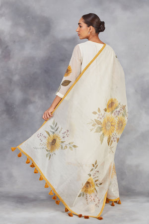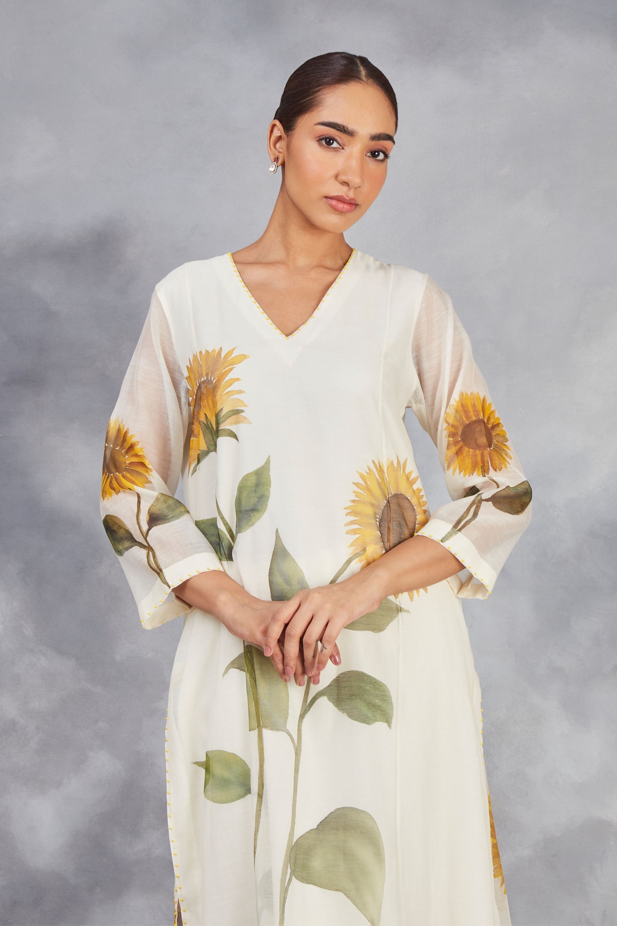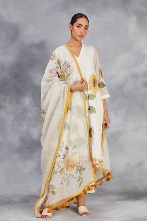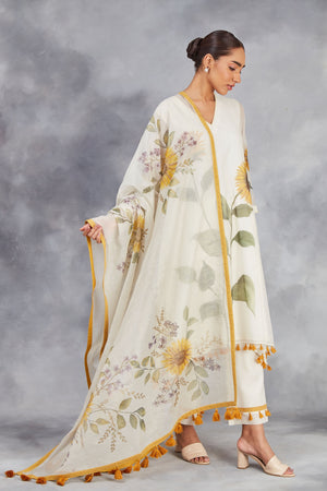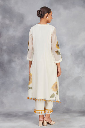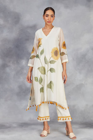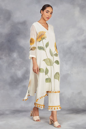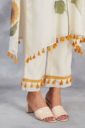 • Experience timeless elegance with our off-white handwoven chanderi mulmul kurta set. The long kurta features a v-neckline and three-quarter sleeves. Matched with a pair of straight pants and a luxurious handwoven cotton tissue dupatta. All accentuated with delicate hand-painted sunflowers, cotton thread tassels and pearls.