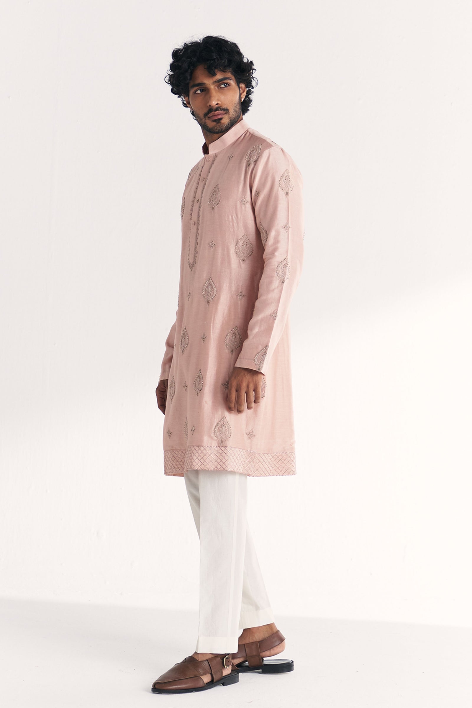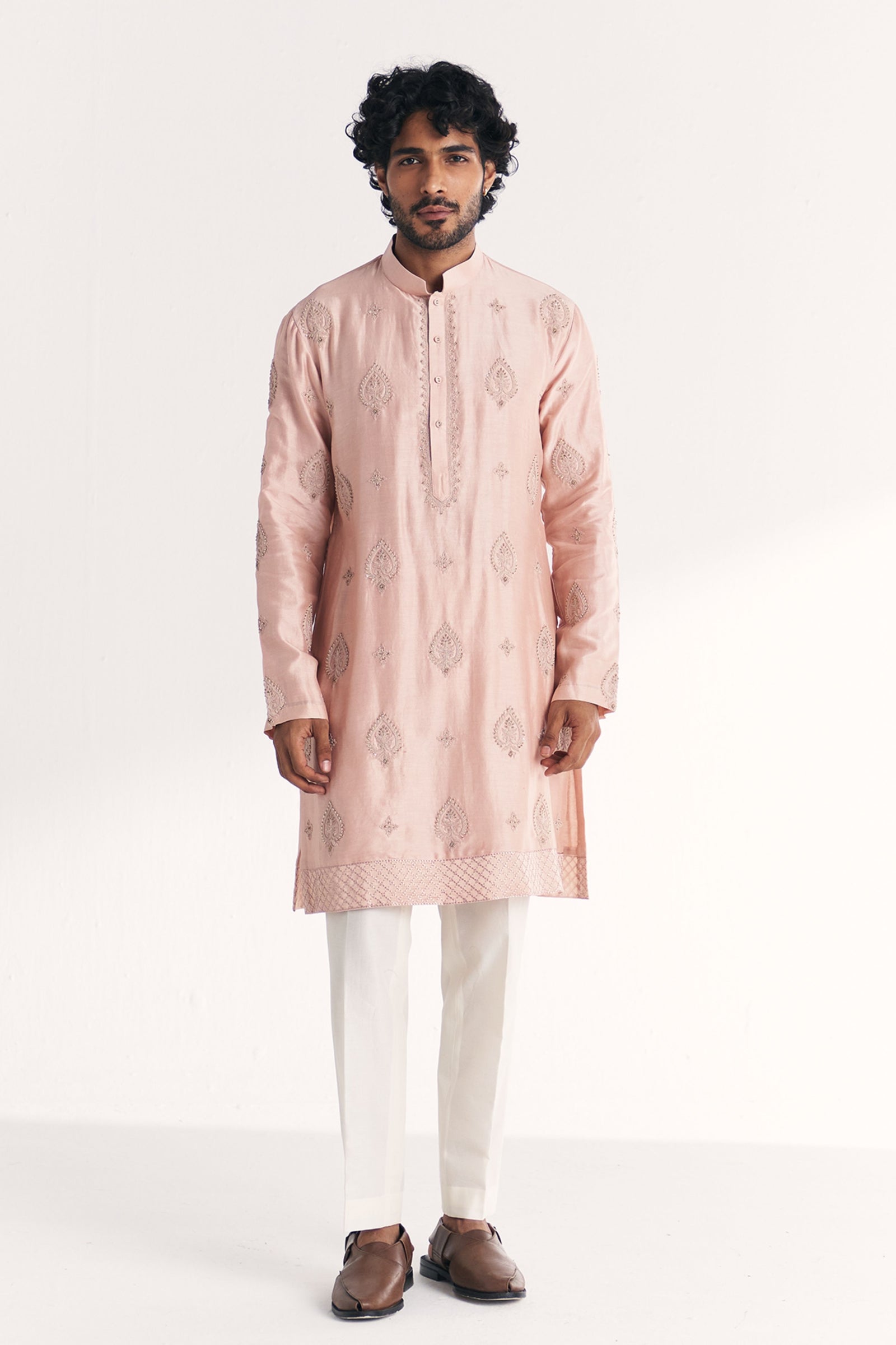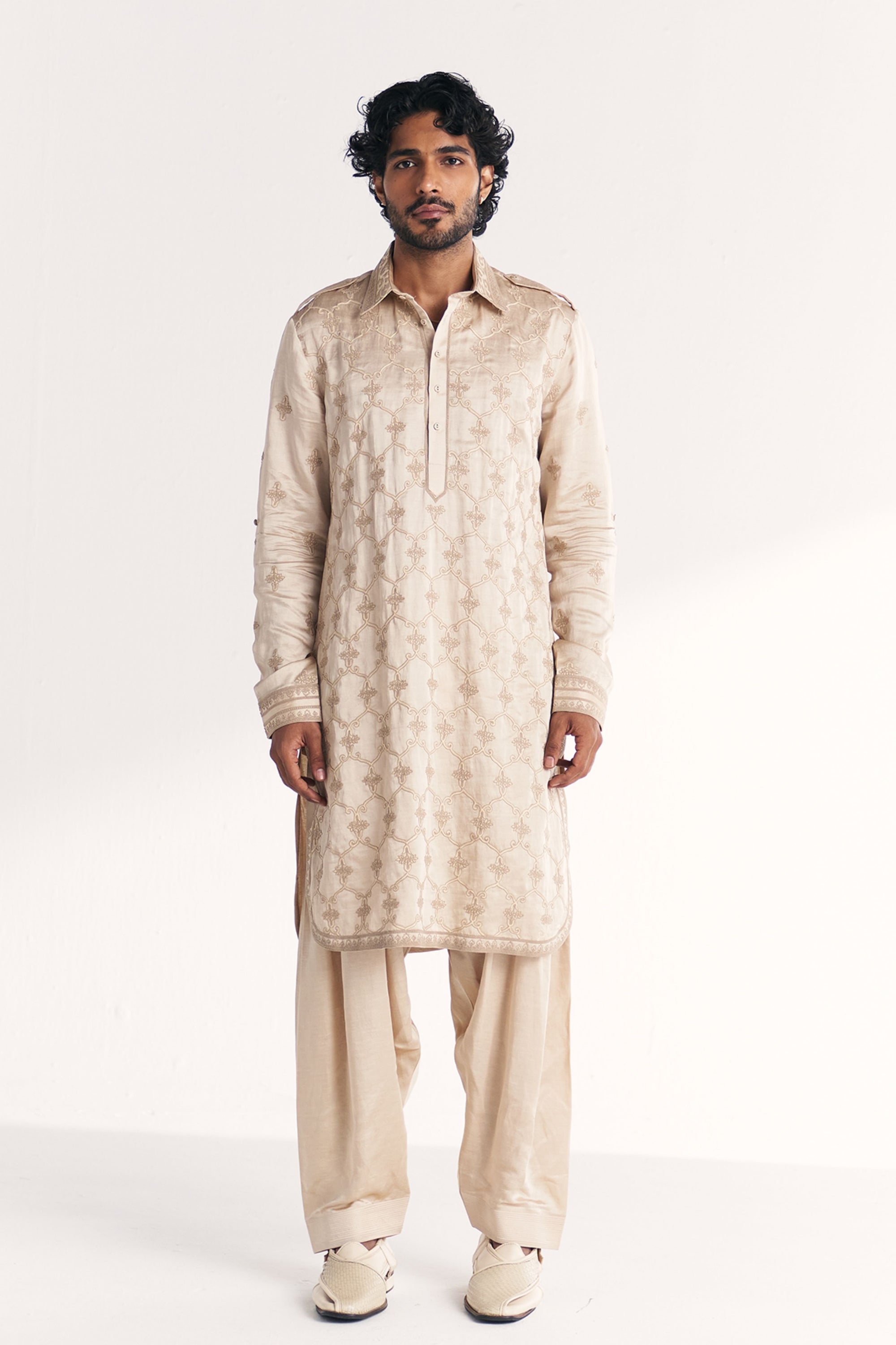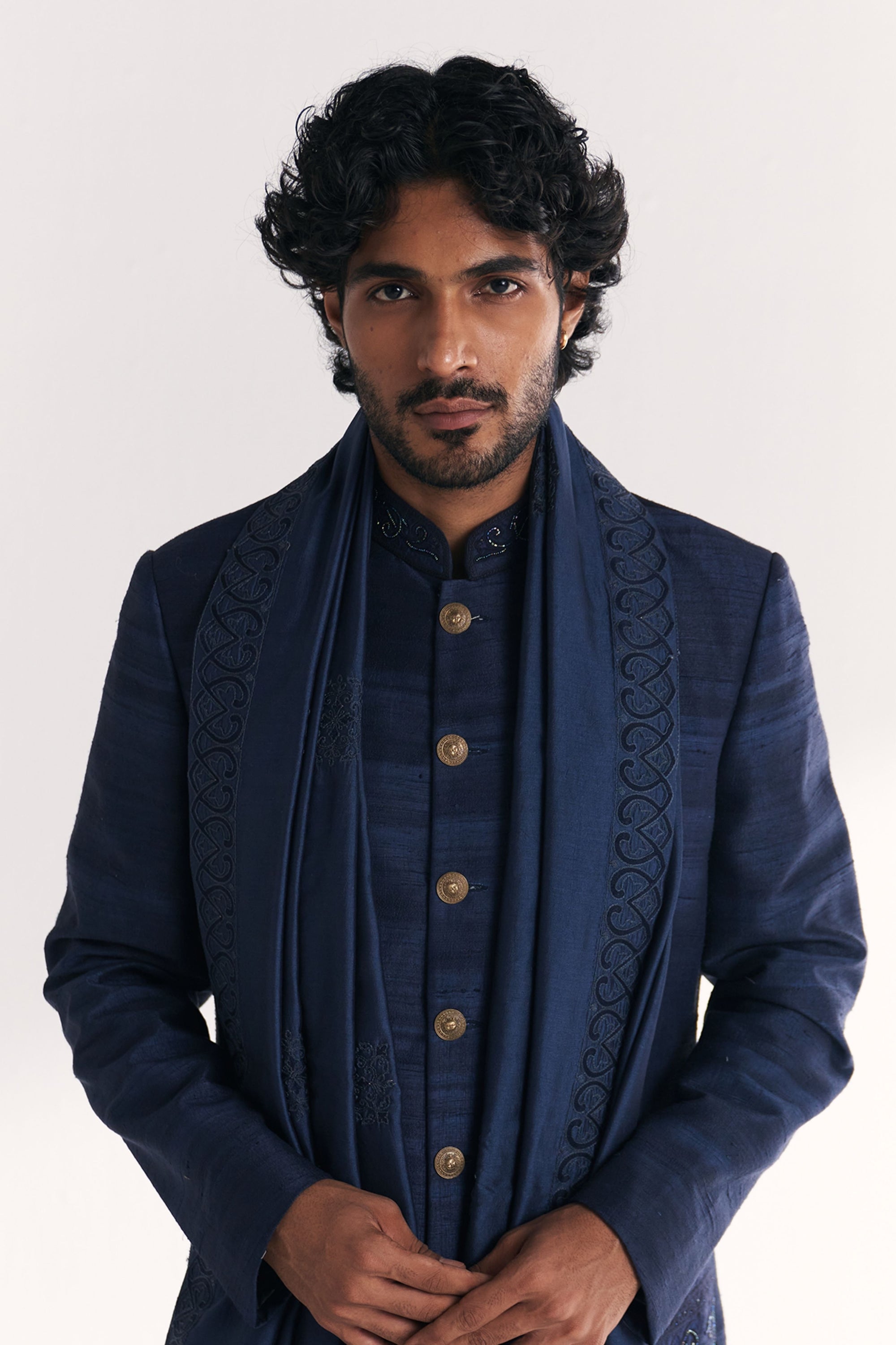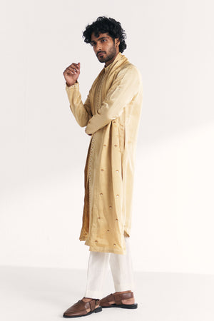 • The set includes yellow kurta with delicate hand embroidery paired with ivory chanderi pants. Finished with hand embroidered stole to give elegant look.