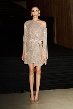 • Made with pure georgette layered in sequins and completed with a 100% satin belt, this dress feels like a chic robe disguised as a glamorous dress. The tan tone makes the style simple with a touch of sexy!
