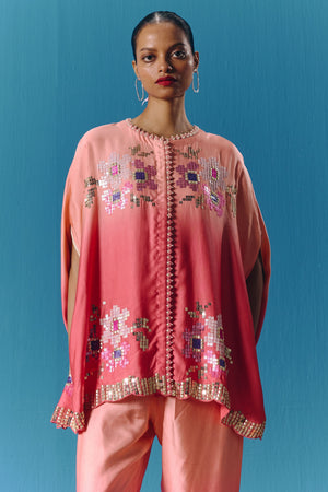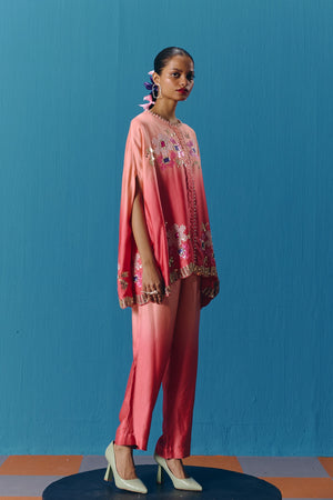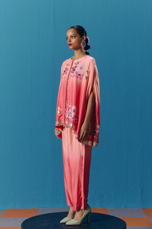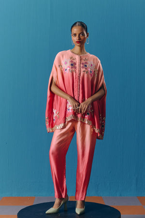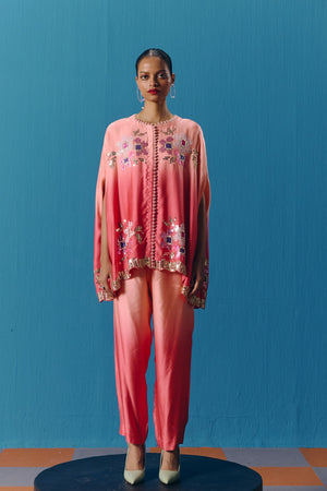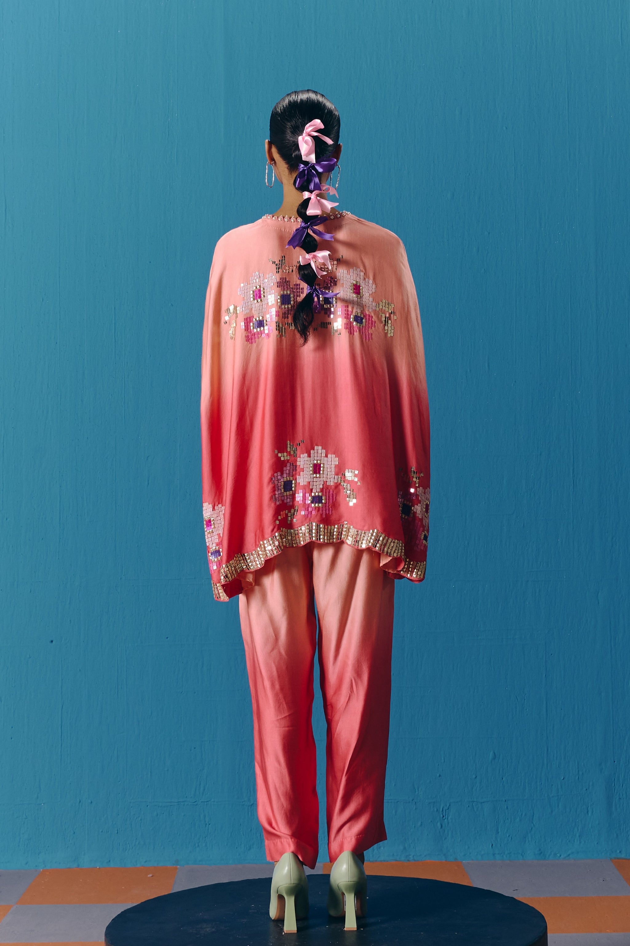 • Soft silk satin cape top with sequins detailing paired with matching pants.