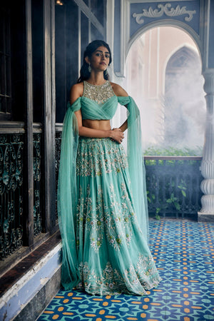 • Our turquoise net 'calliope' lehenga is embellished with crown motif design paired with net draped blouse