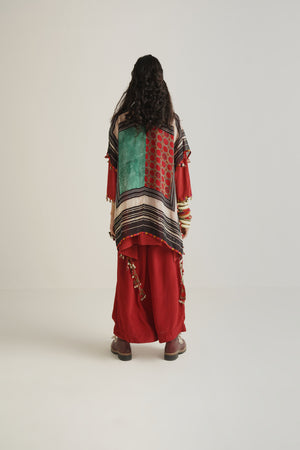 • Printed sheer silk jacket with embroidered neck and tribal tassel detail on neck and hem.
