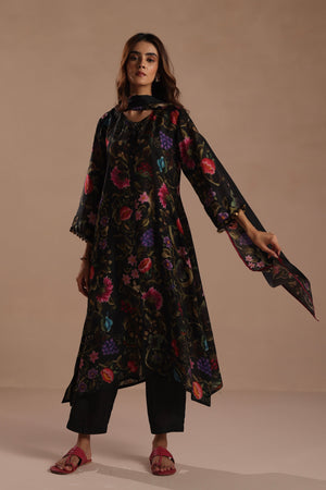 • A black habutai silk dupatta with floral prints four sided border and a magenta accents, designed to complement the vine kurta set. The Dupatta length-95'' and the Dupatta width-19''