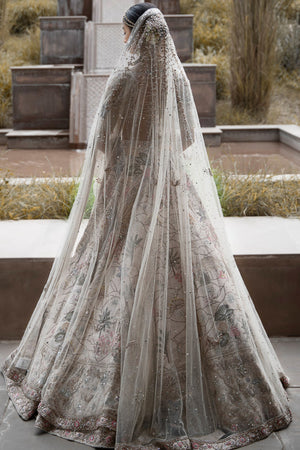 • Nature-inspired motifs on an off-white raw silk base take centre stage in the vintage udai bagh lehenga. Multi-coloured resham aari, tarnished dori work, hand embroidery using nakshi, dabka, sequins, mirrors, and zardozi accentuate the modern aesthetic. It is paired with a net dupatta and veil.