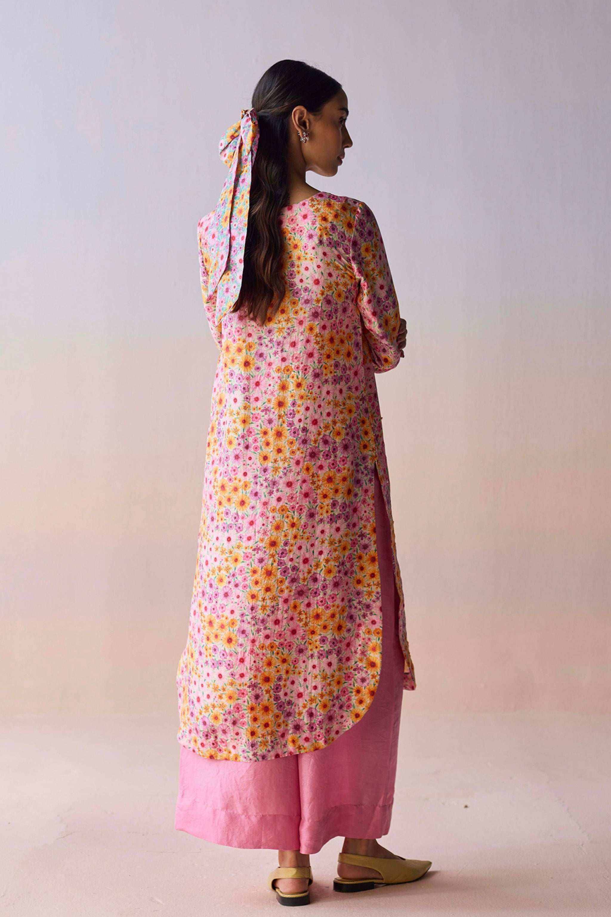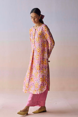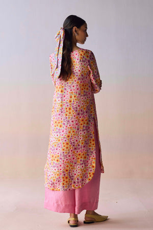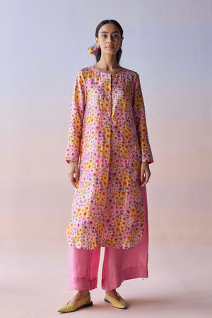 • Like a garden touched by first light, the wildflower dawn kurta set blooms in coral pink with a spirit that is soft yet quietly radiant. It carries the ease of mornings unhurried, inviting comfort in every fold. Handspun in malda silk, the kurta features a delicate all-over hand-painted floral print, with a center-front button opening that adds both detail and ease. Buttoned cuffs and a rounded hem lend refinement to its relaxed fit, while wide-bottom pants complete the set with graceful fluidity. The model is 5’7″ tall and wearing xs size.