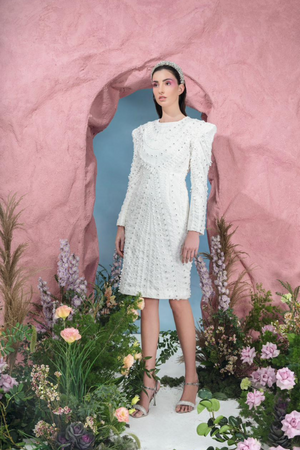 • off white structured dress with geometric applique laces and silver motifs with high shoulder detail and full sleeves