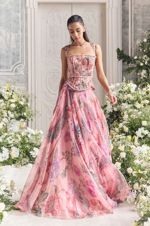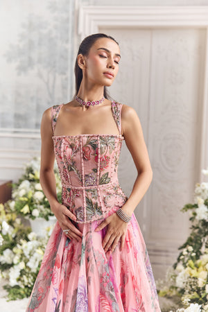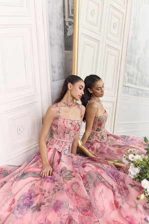 • Embroidered corset featuring detachable straps paired with heavy dupatta and floral lehenga