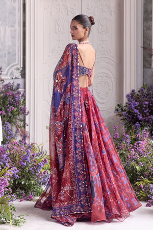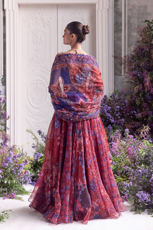 • Red embroidered bralette paired with embroidered dupatta and floral lehenga