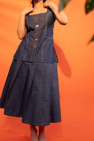 • A denim top and skirt co-ord set adorned with detailed buttons offers a timeless and versatile ensemble suitable for various occasions. This coordinated outfit combines classic denim appeal with contemporary design elements, providing both comfort and style.