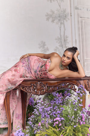 • Hand embroidered corset paired with heavy embroidered pre draped saree