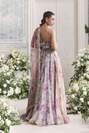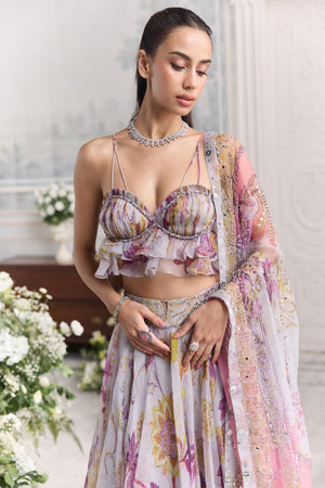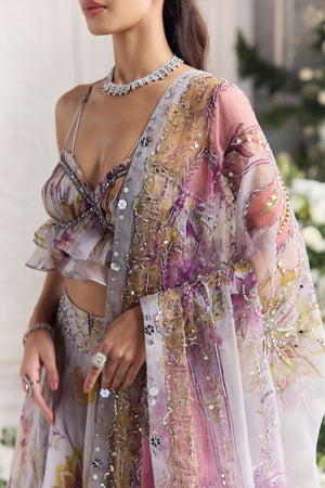 • Ruffled bustier peplum top paired with heavy chunni and floral lehenga