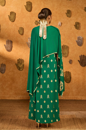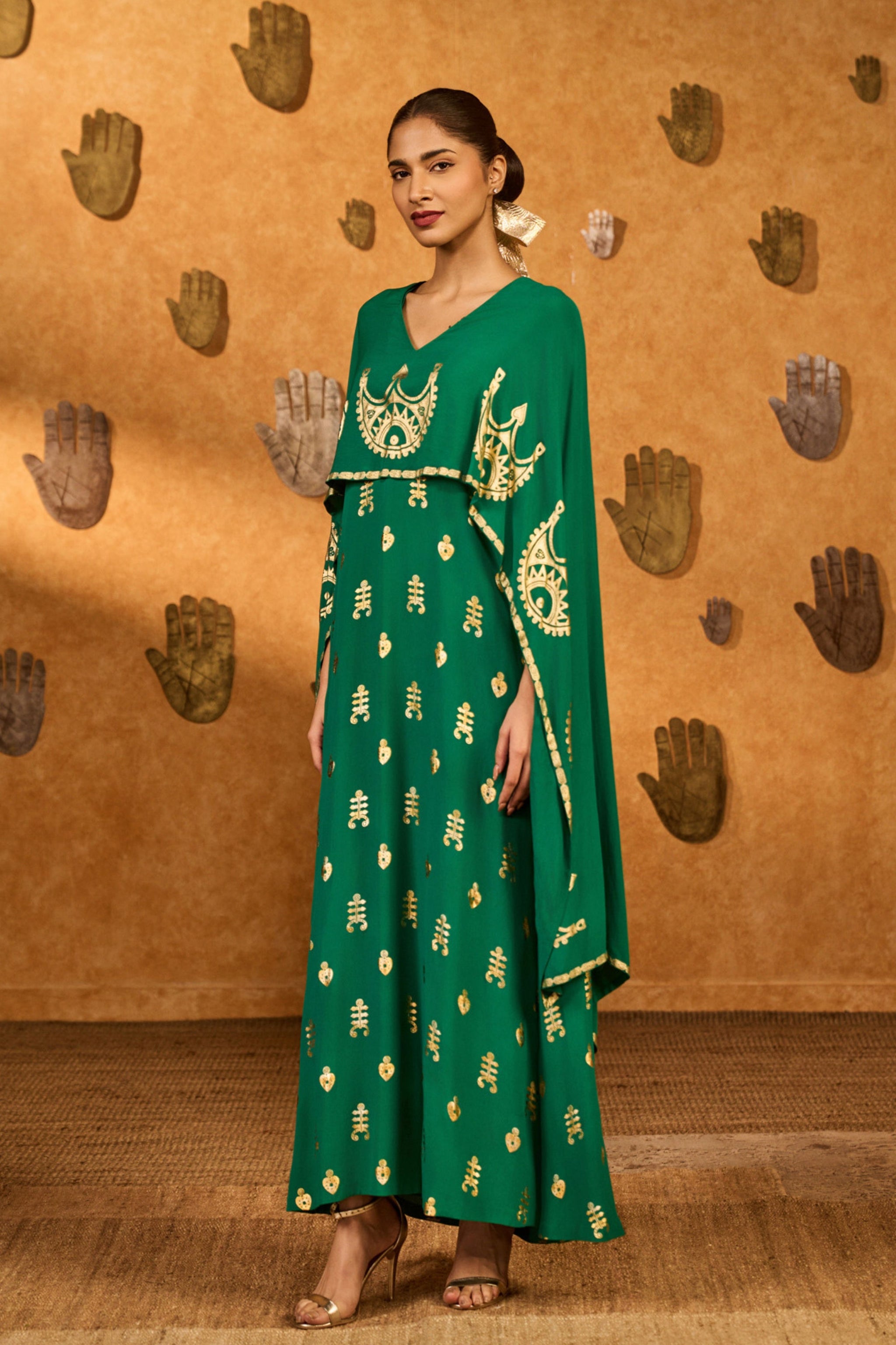 • A graceful green kaftan, featuring a lunar crown print on the top half and a locket loop foil print on the bottom half. Finished with a foil-printed border all over, the piece blends striking motifs with refined detailing.