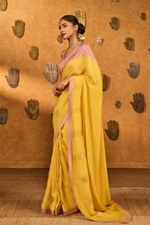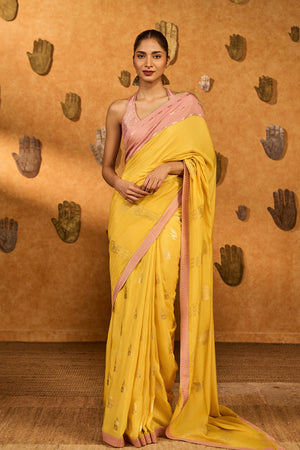 • This yellow and champagne pink saree in fluid mul silk features delicate gold foil motifs across the pleats and pallu. The pallu is highlighted with a finely woven jacquard border that adds a structured elegance to the drape. Paired with a champagne pink blouse in rich jacquard silk, the look is a perfect blend of softness and refinement—ideal for festive daywear or intimate celebrations.