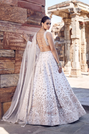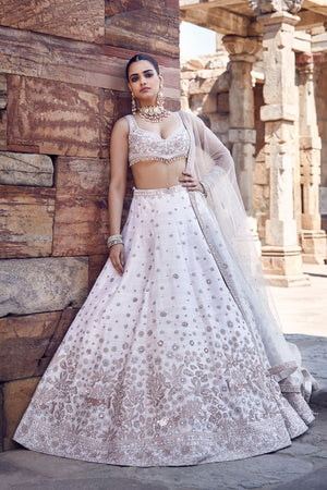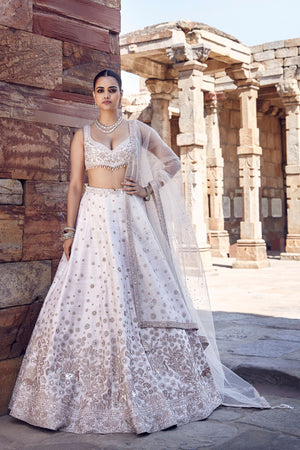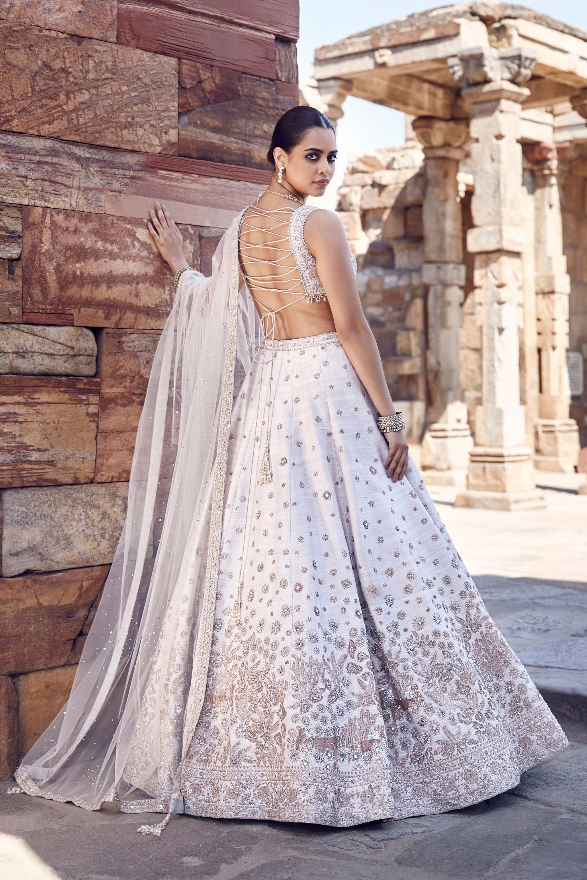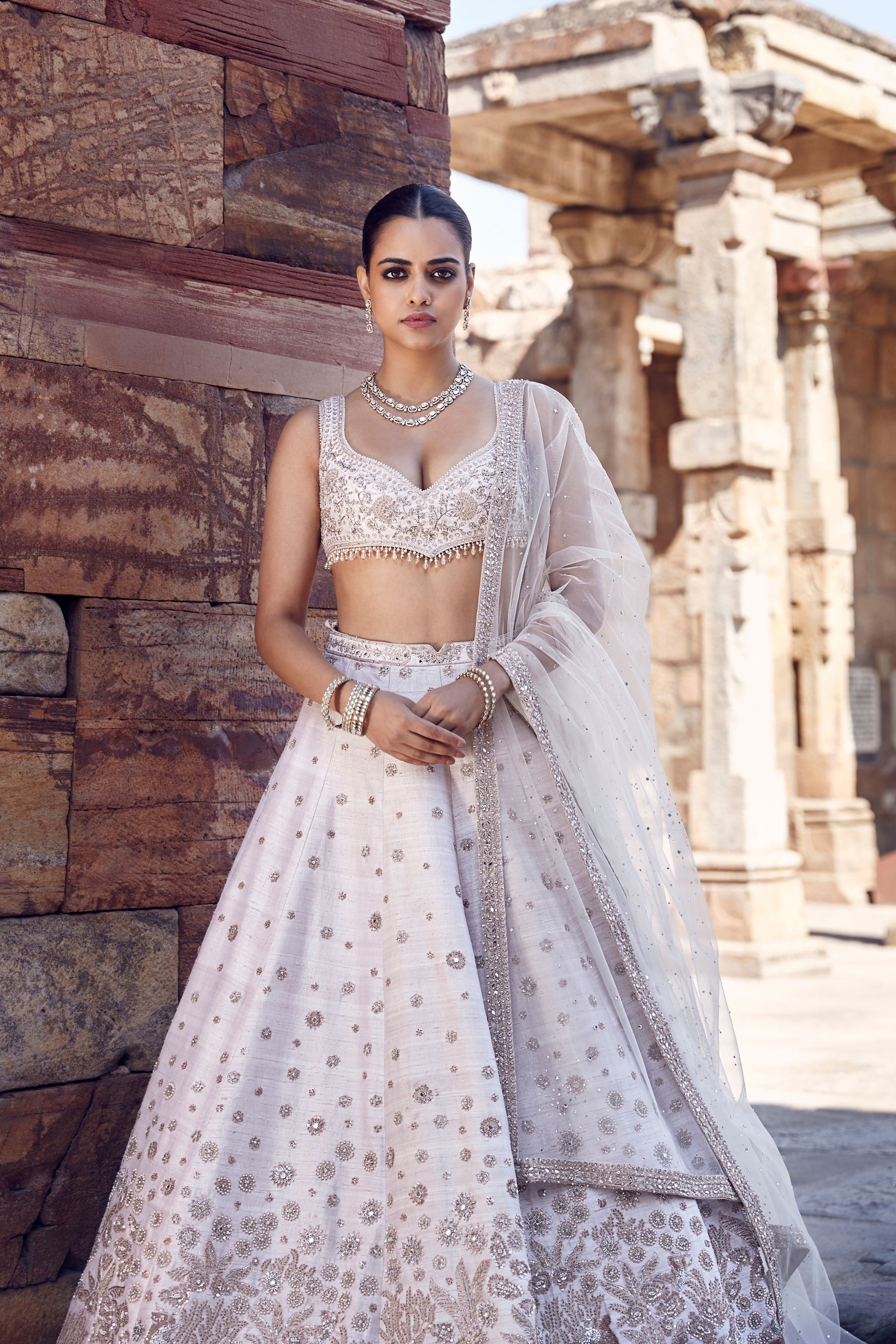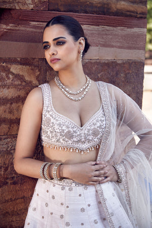 • Introducing the Ekru Royal Nandi Lehenga in ivory raw silk, the new definition of luxury. Featuring Anmol dori work and intricate hand embroidery with pearls, mirrors, and sequins, this lehenga showcases our commitment to using traditional Indian craftsmanship in unparalleled ways. The detailed floral and paisley patterns combine with our unconventional yet signature V-wing design.