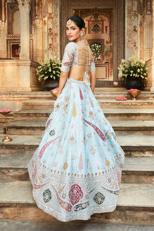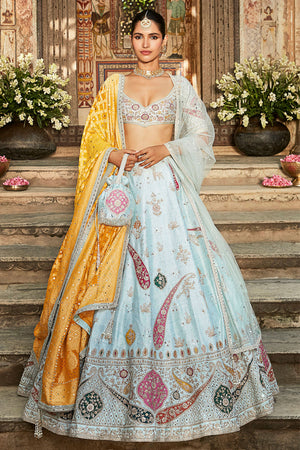 • The lehenga features rambagh silk in a jaipuri sky colour with nakshi, gota & zardozi crafts. Blouse on golden ivory rambagh silk. Comes with a yellow gharchola and a powder blue net dupatta. The pattern of gharchola may vary from product to product as it is a handwoven piece, and each piece is unique in design.