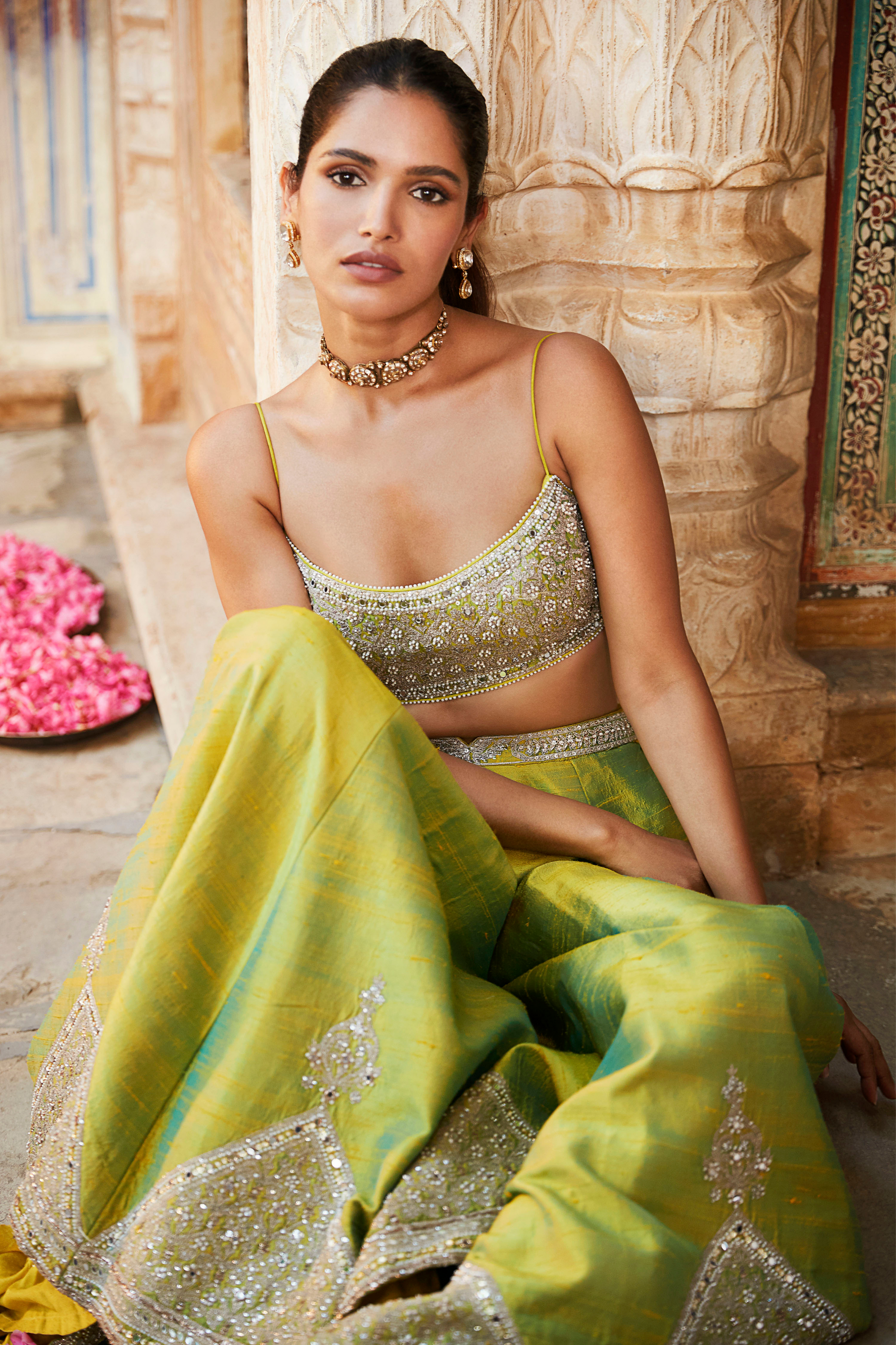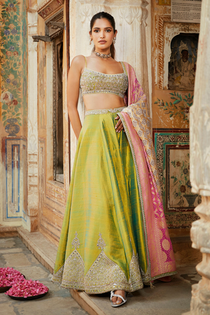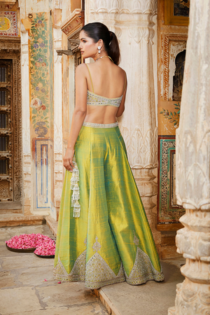 • It is a sharara paired with dupatta and crop top created on a two tone silk with green & gold in the warp & weft. Embellished with kachi dori, zardozi & mirrors. The pattern of gharchola may vary from product to product as it is a handwoven piece, and each piece is unique in design.