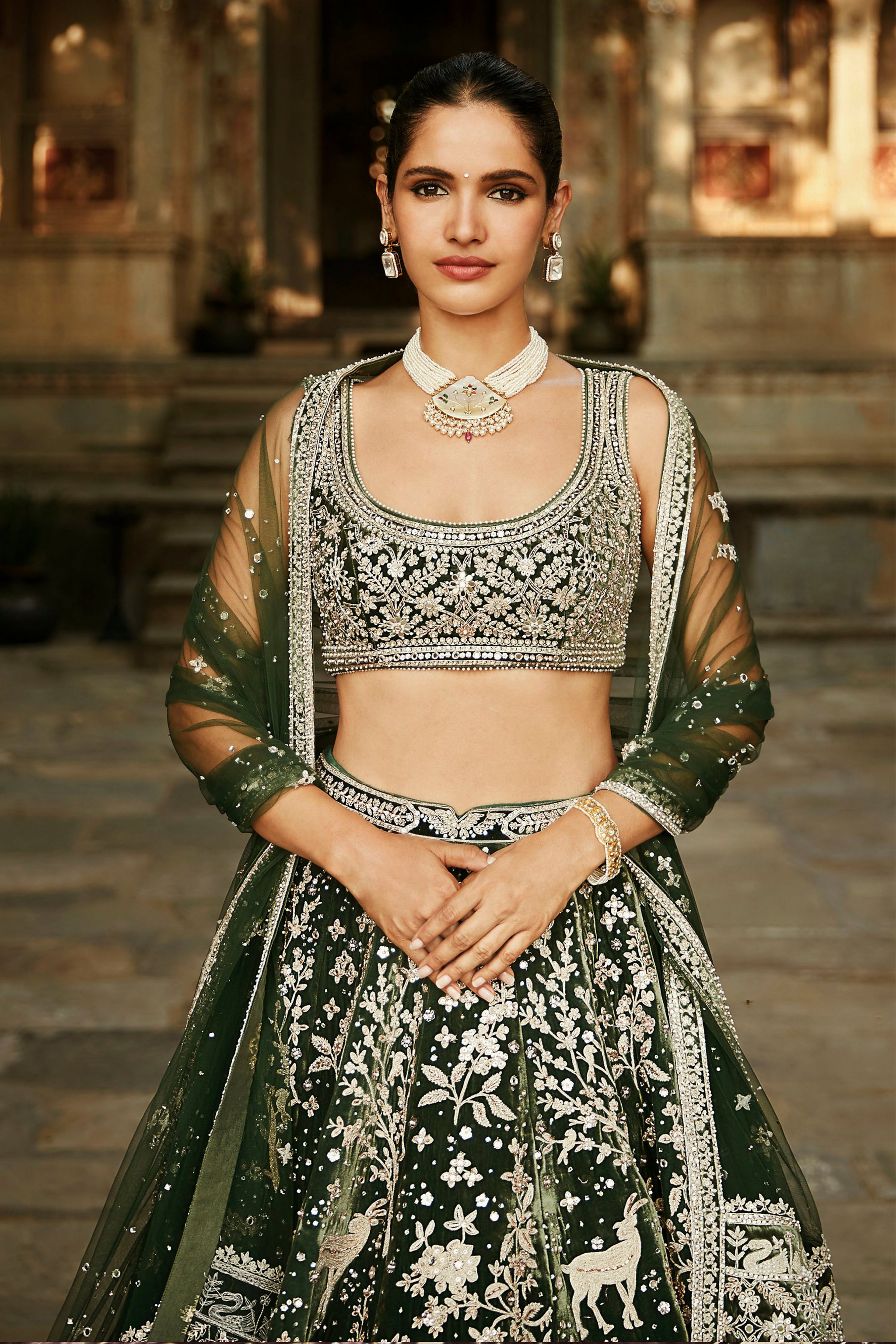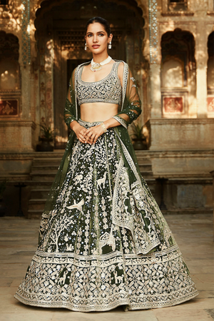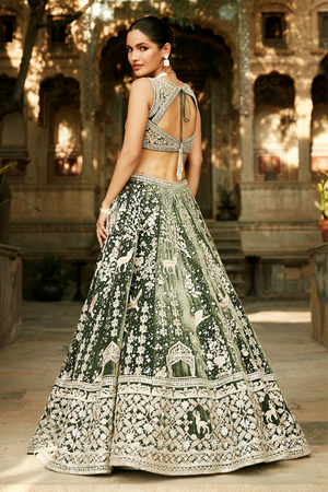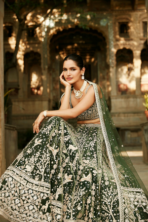 • Lehenga with suchi dori, zardozi & little jaipuri mirrors paired with blouse and dupatta panelled with an antelope.