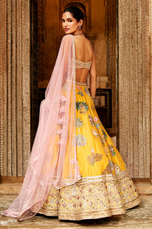 • It is a lehenga in pichwai motifs in resham adorned with zardozi with a gota appliqué border paired with blouse and flamingo pink dupatta.