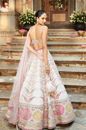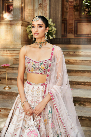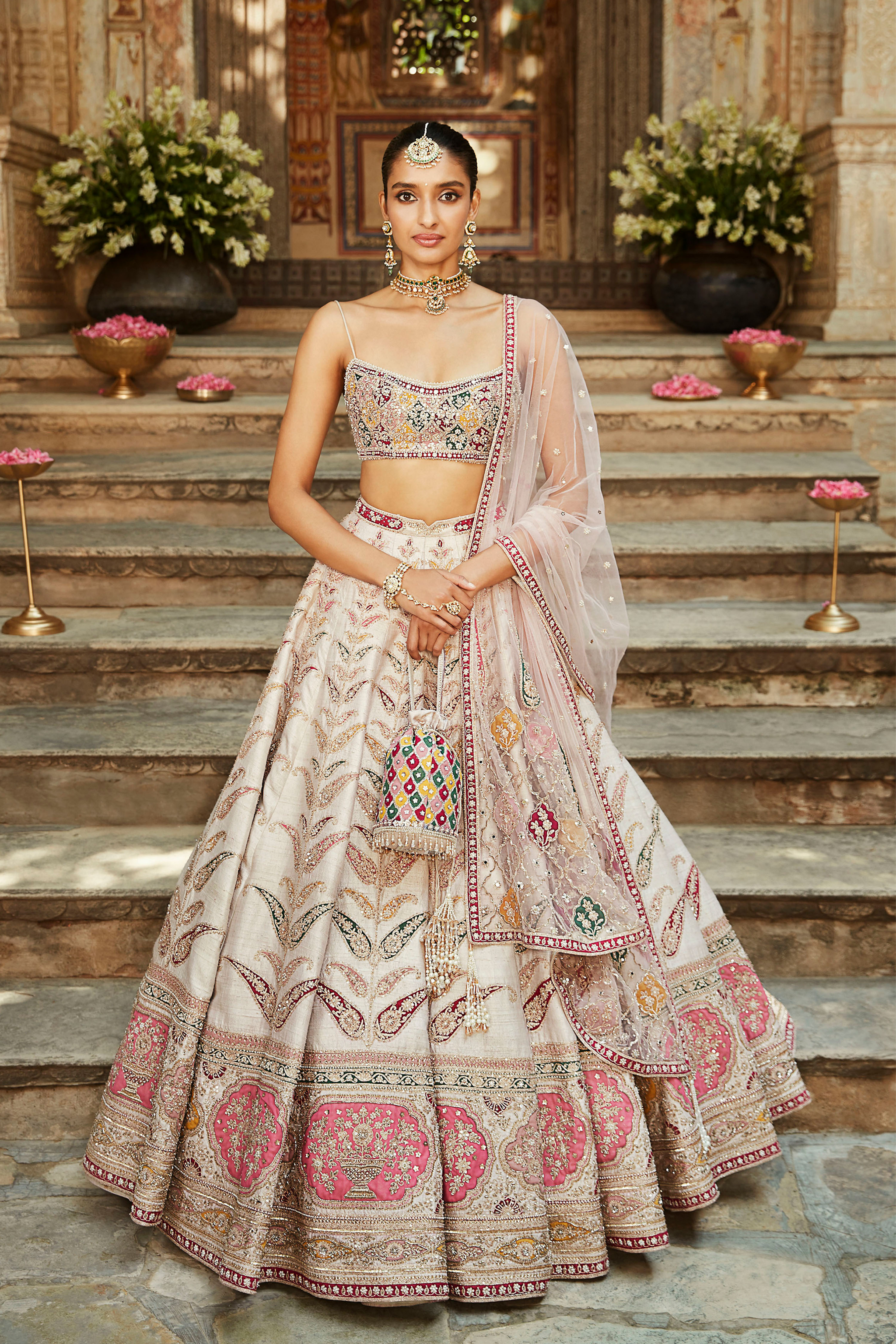 • It is a lehenga with nakshi, gota & zardozi on golden ivory rambagh silk paired with blouse, dupatta in a blush rose with zardosi & gota and potli