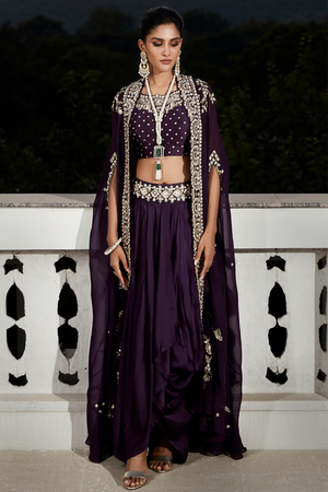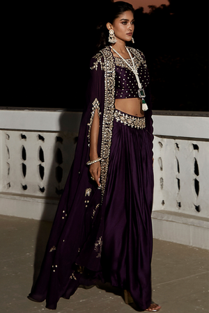 • Handcrafted with pittan, kasab ari & zardosi the royal matsya cape created with plant based soft georgette organza the design features incuts over the elbows & intricate embroidery all over. The artwork is heritage inspired with signature matsya detailing in tarnished silver. The bottom is a draped skirt.