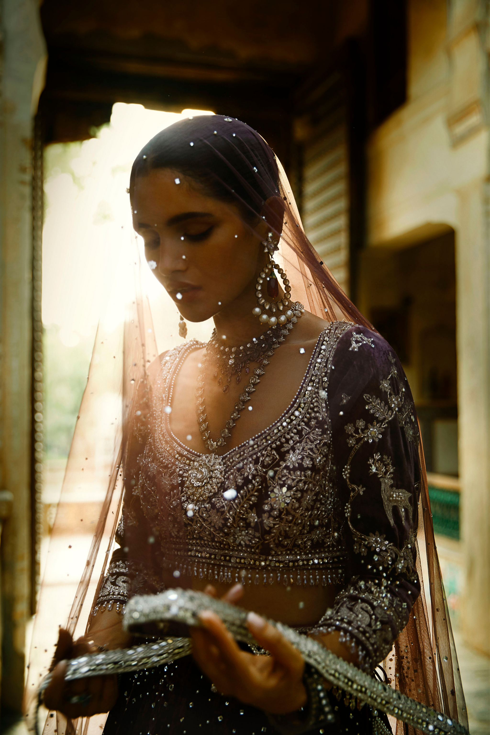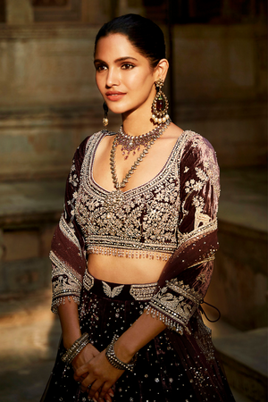 • It is a lehenga with old world temple embroidery on a night sky created with kachi dori, zardozi & swarovski crystals on lush plum silk velve paired with blouse and dupatta