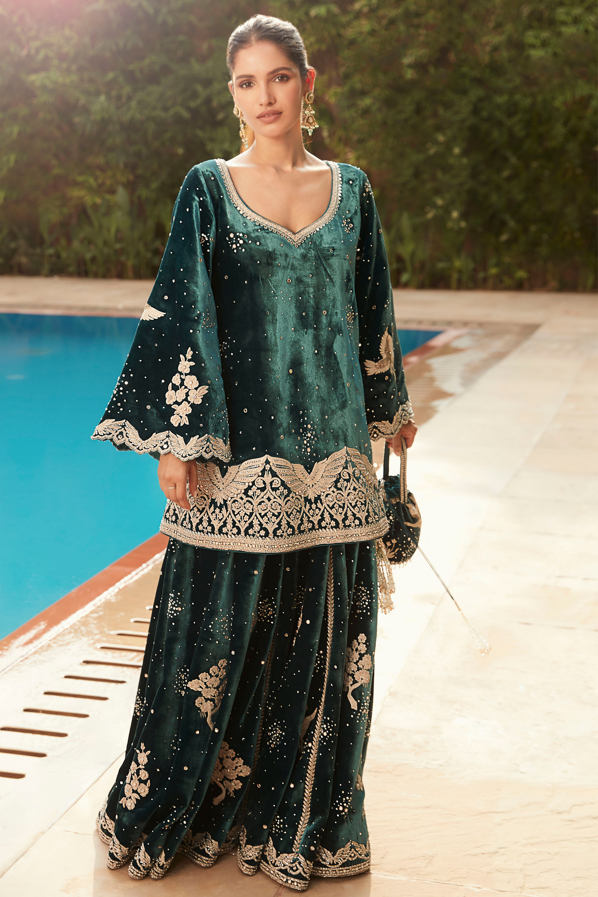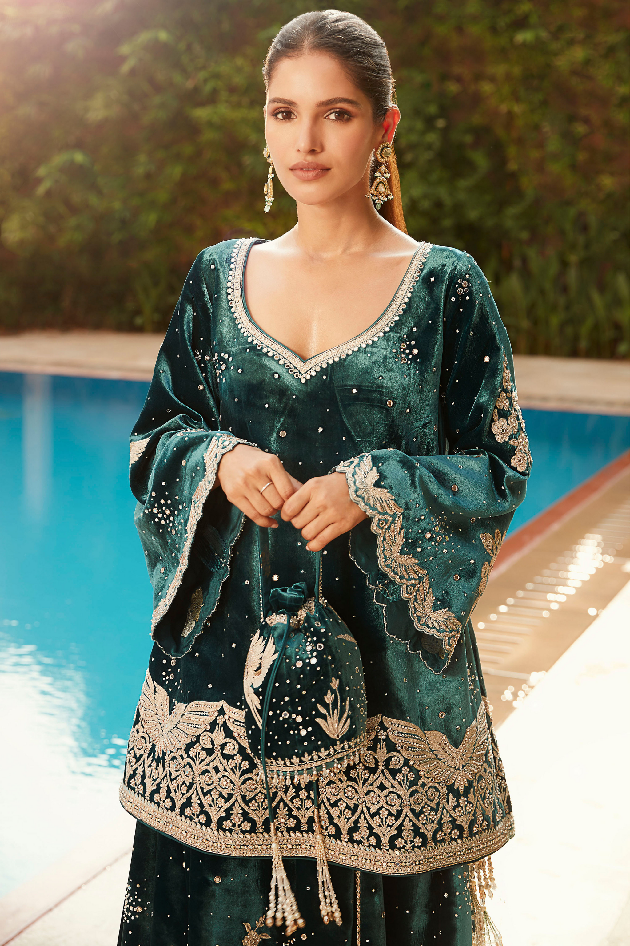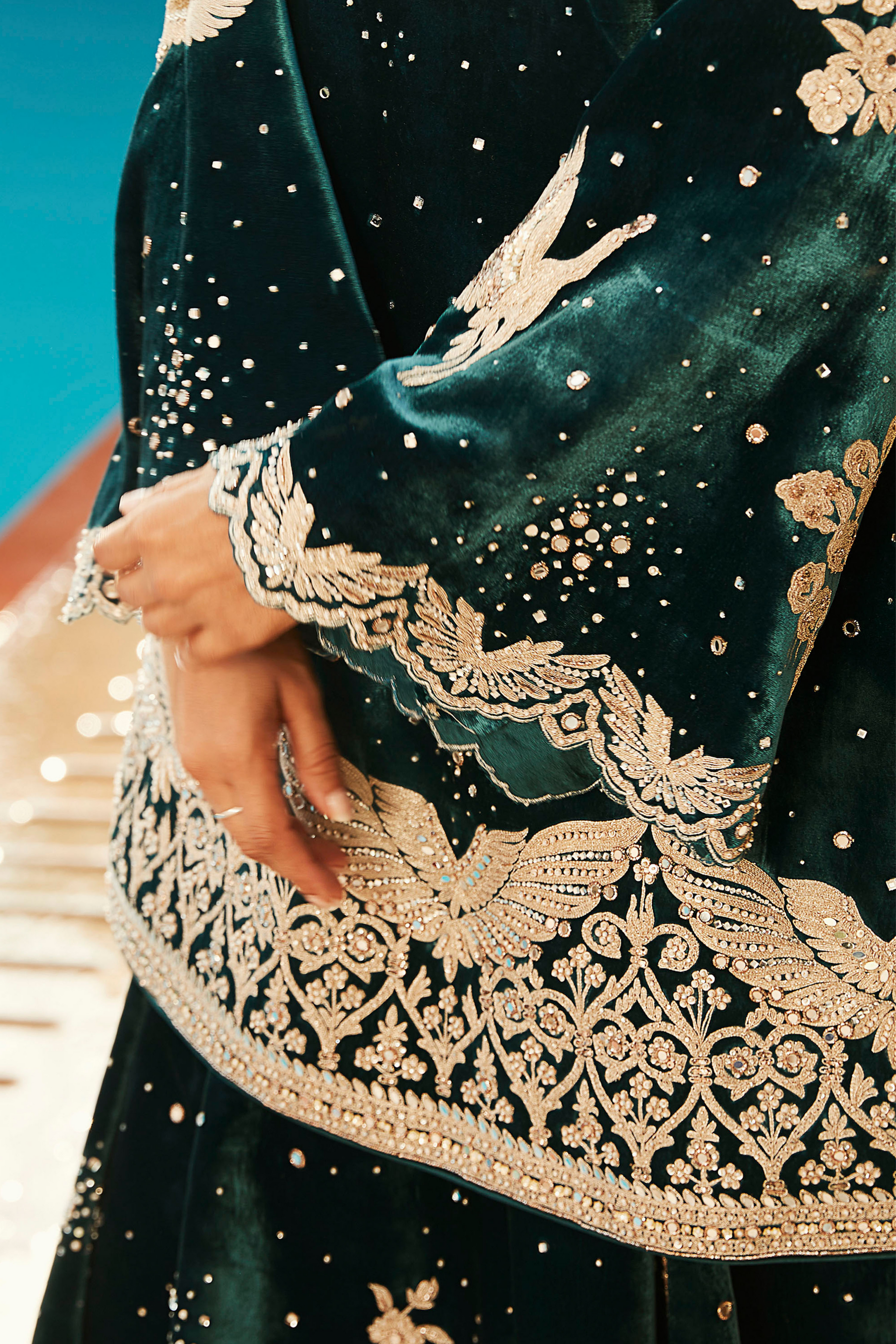 • The kurta border has a set of 3 wings, and the sharara has the forest come to life on it. Dupatta & potli come with the set.
