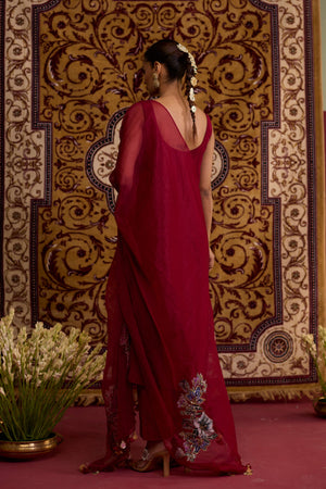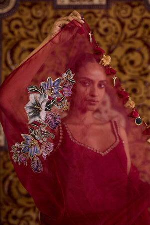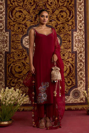 • This elegant three-piece set includes a kurta, pants, and a dupatta. The kurta is crafted from hand-embroidered crepe fabric, adding intricate detail and texture. The pants are straight-cut and made from smooth crepe, offering a sleek silhouette. Completing the ensemble is a hand-embroidered organza dupatta, providing a delicate and refined finishing touch.