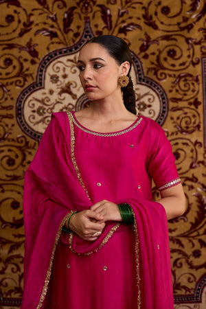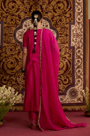 • This elegant three-piece set includes a kurta, pants, and a dupatta. The kurta is crafted from hand-embroidered chanderi silk, featuring intricate detailing. The pants are made from chanderi silk and adorned with hand embroidery, adding a refined touch. Completing the ensemble is a hand-embroidered chanderi silk dupatta, enhancing the overall graceful look.