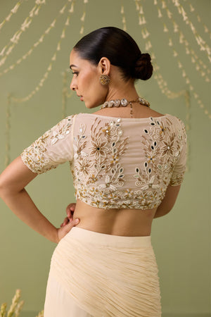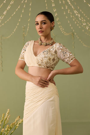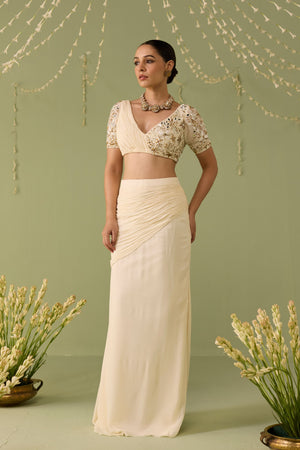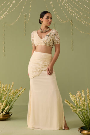 • This two-piece set includes a skirt and a stitched blouse. The skirt is a georgette lehenga, designed for a graceful and flowing silhouette. The blouse is made from hand-embroidered georgette fabric and comes stitched, adding an elegant and detailed touch to the ensemble.