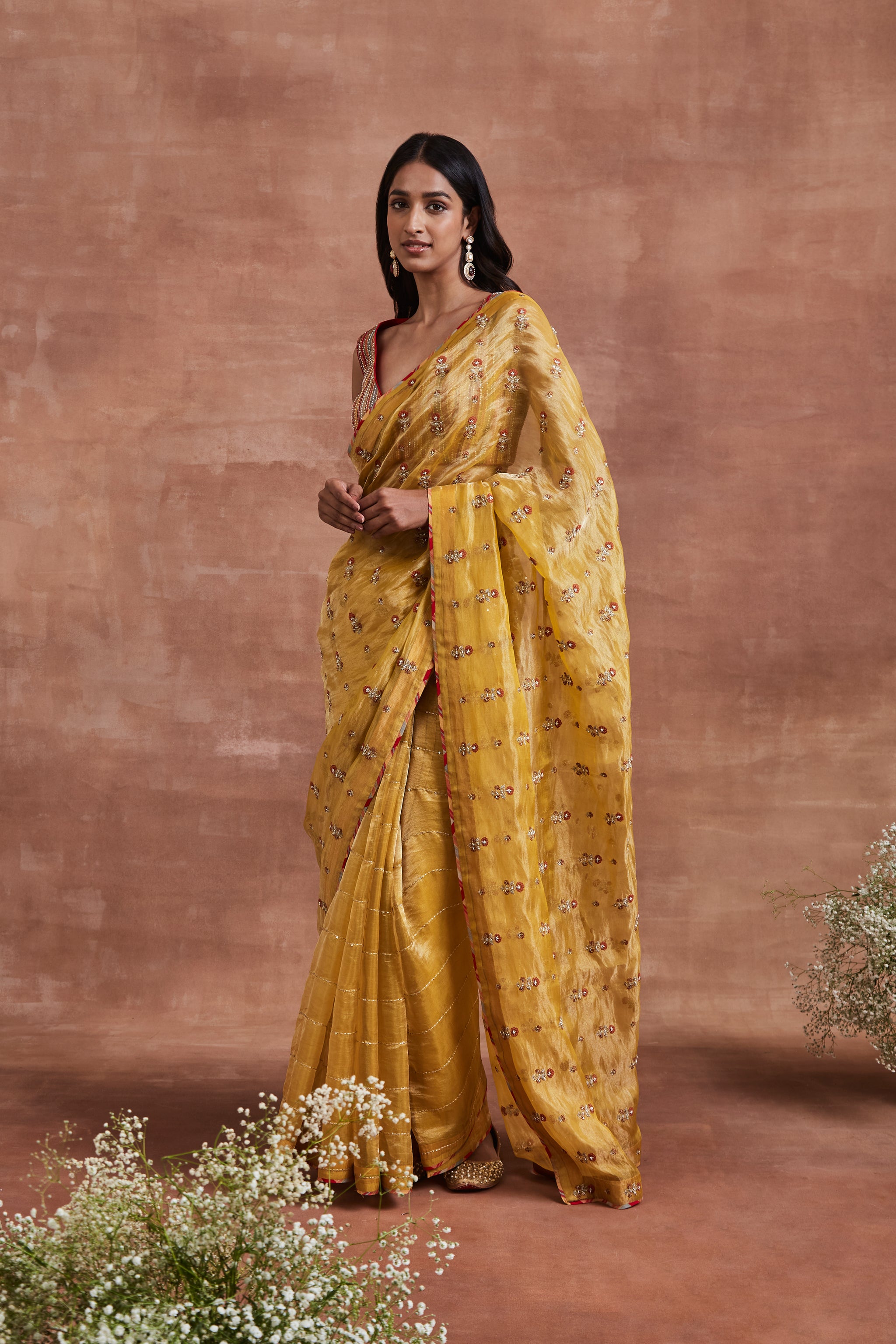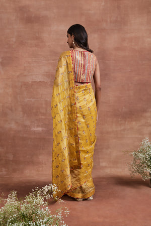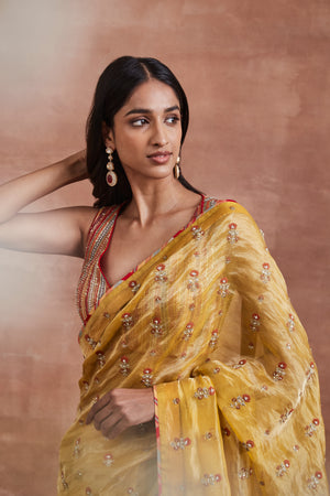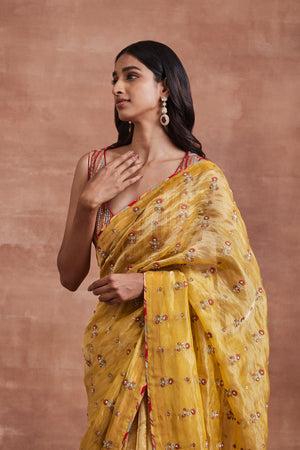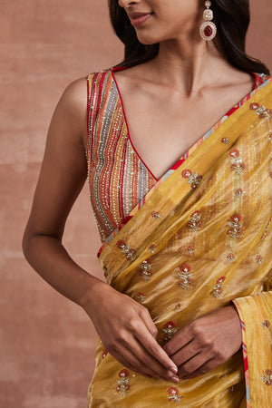 • Embrace the essence of elegance with our Yellow Handwoven Silk Tissue Saree, adorned with an organza floral patchwork pallu and zari stripes with embroidered sequins on the skirt. Paired with a beautifully handwoven cotton Banarasi multicolour striped blouse highlighted with sequins and pearls, this ensemble exudes grace and sophistication.