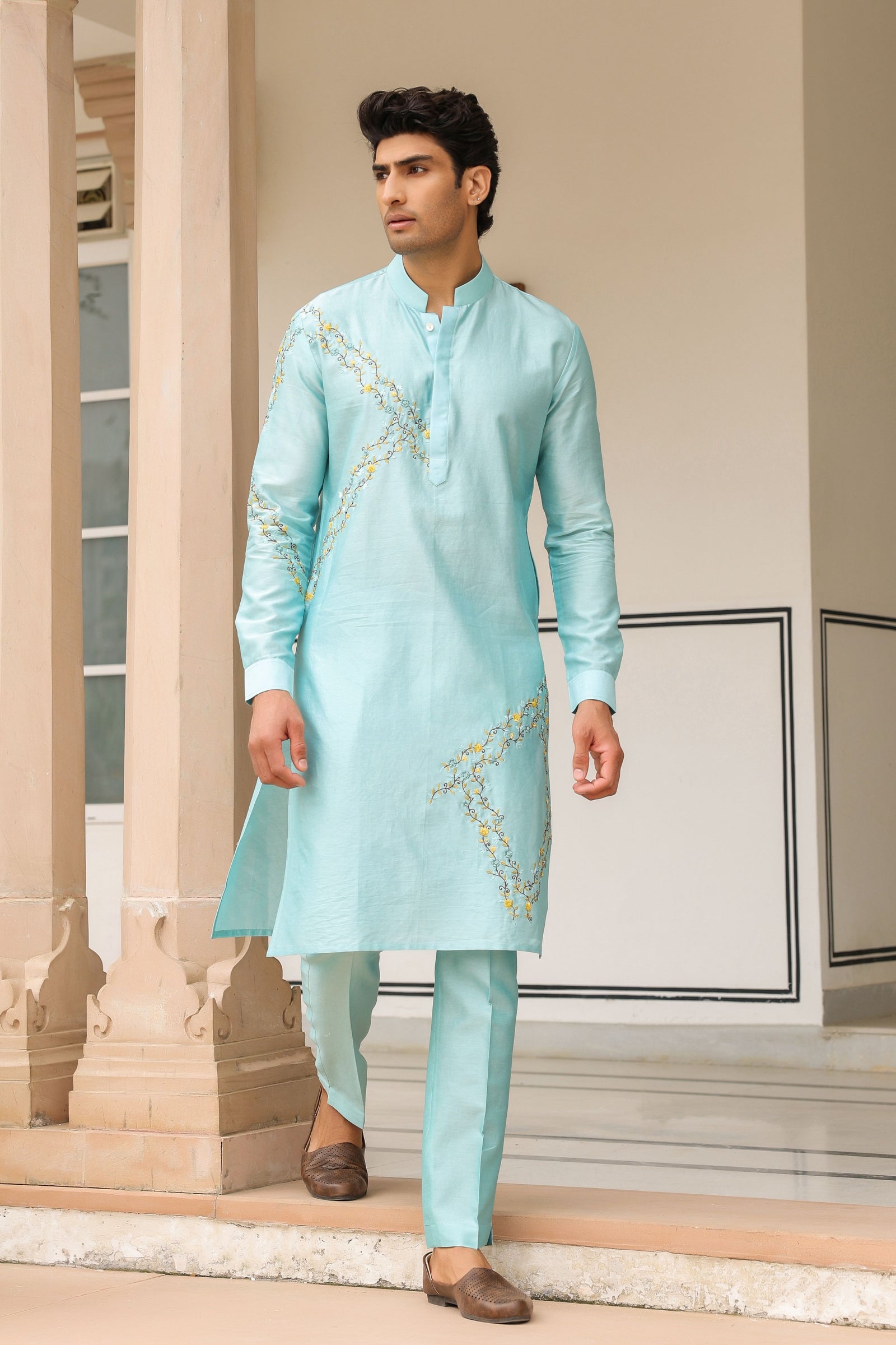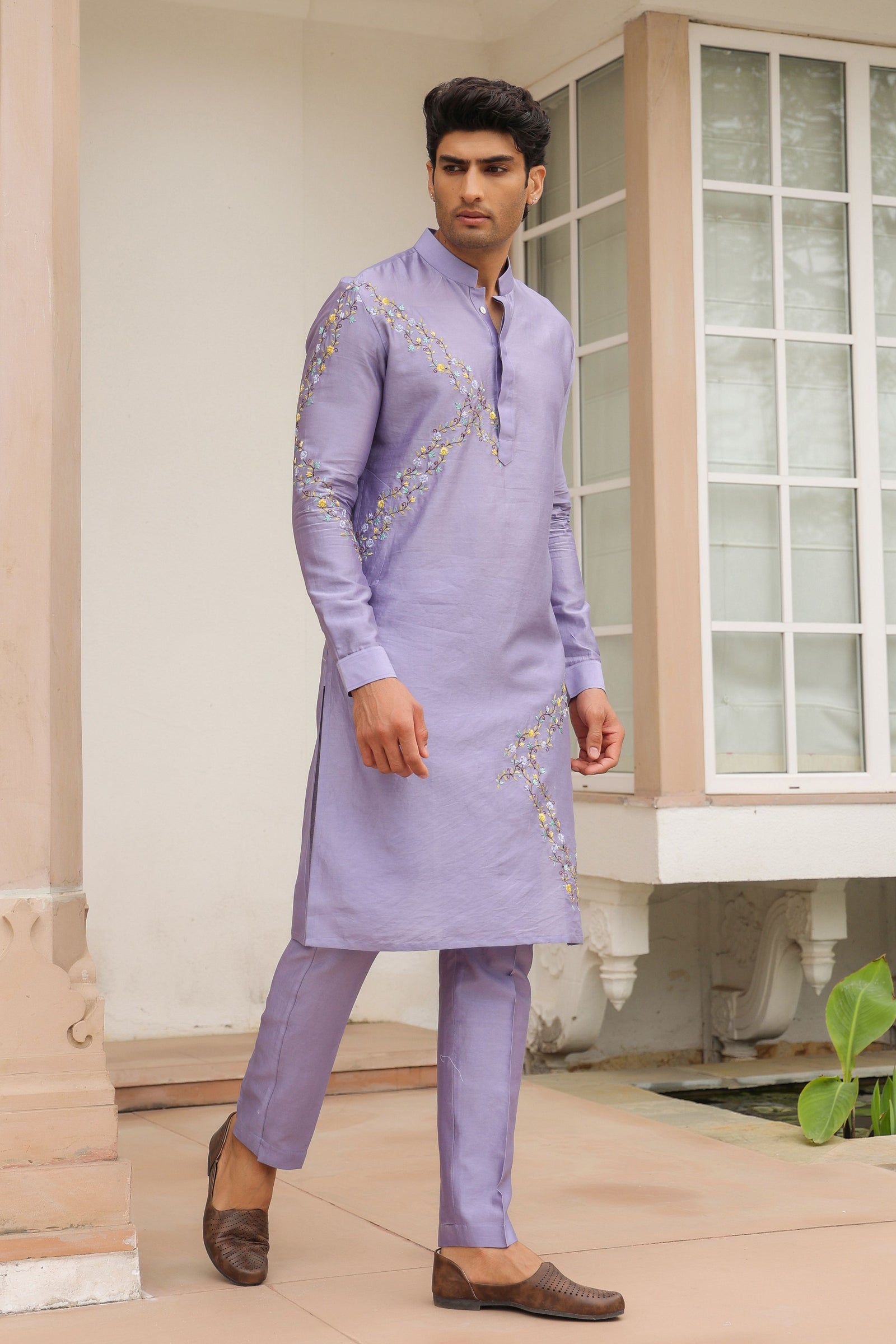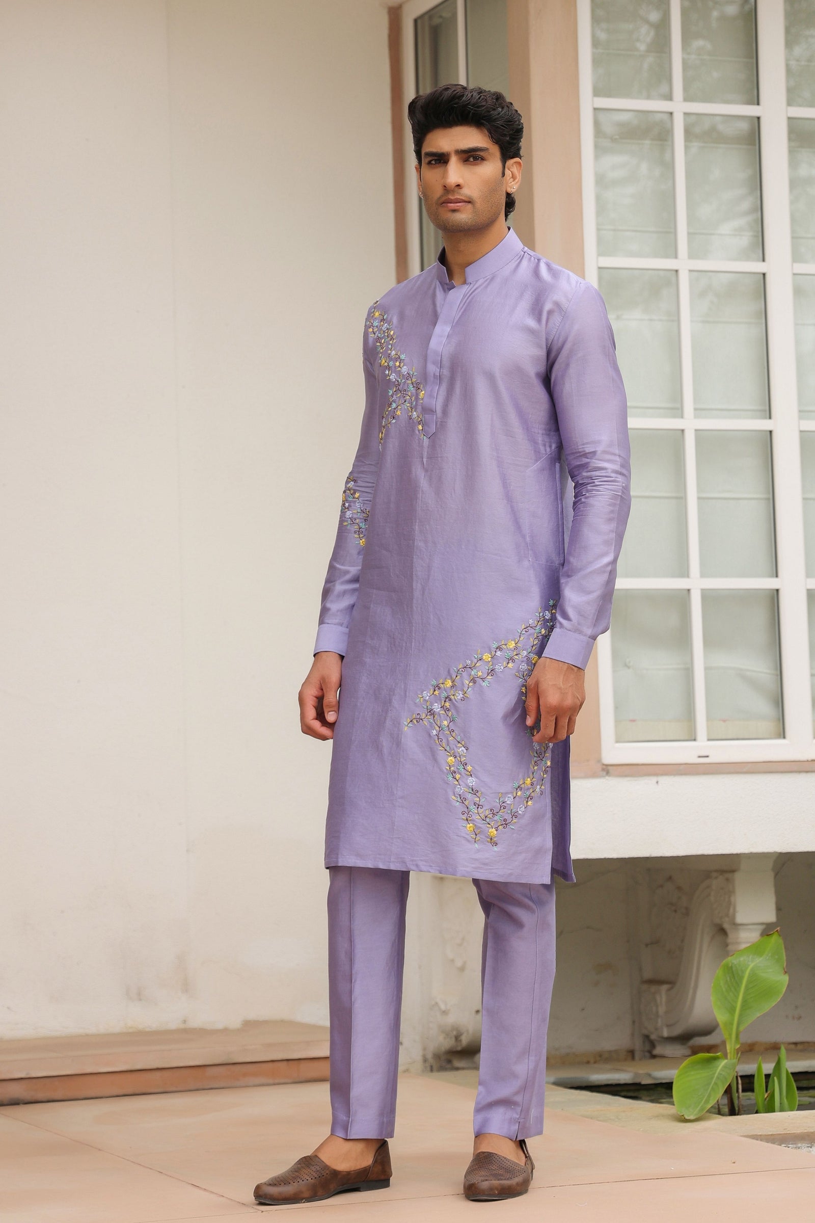 • This 3 piece kurta bandi set features delicate floral threadwork embroidery on the bandi. It is paired with an embroidered kurta with narrow pants. It is made using the finest chanderi silk from benaras.