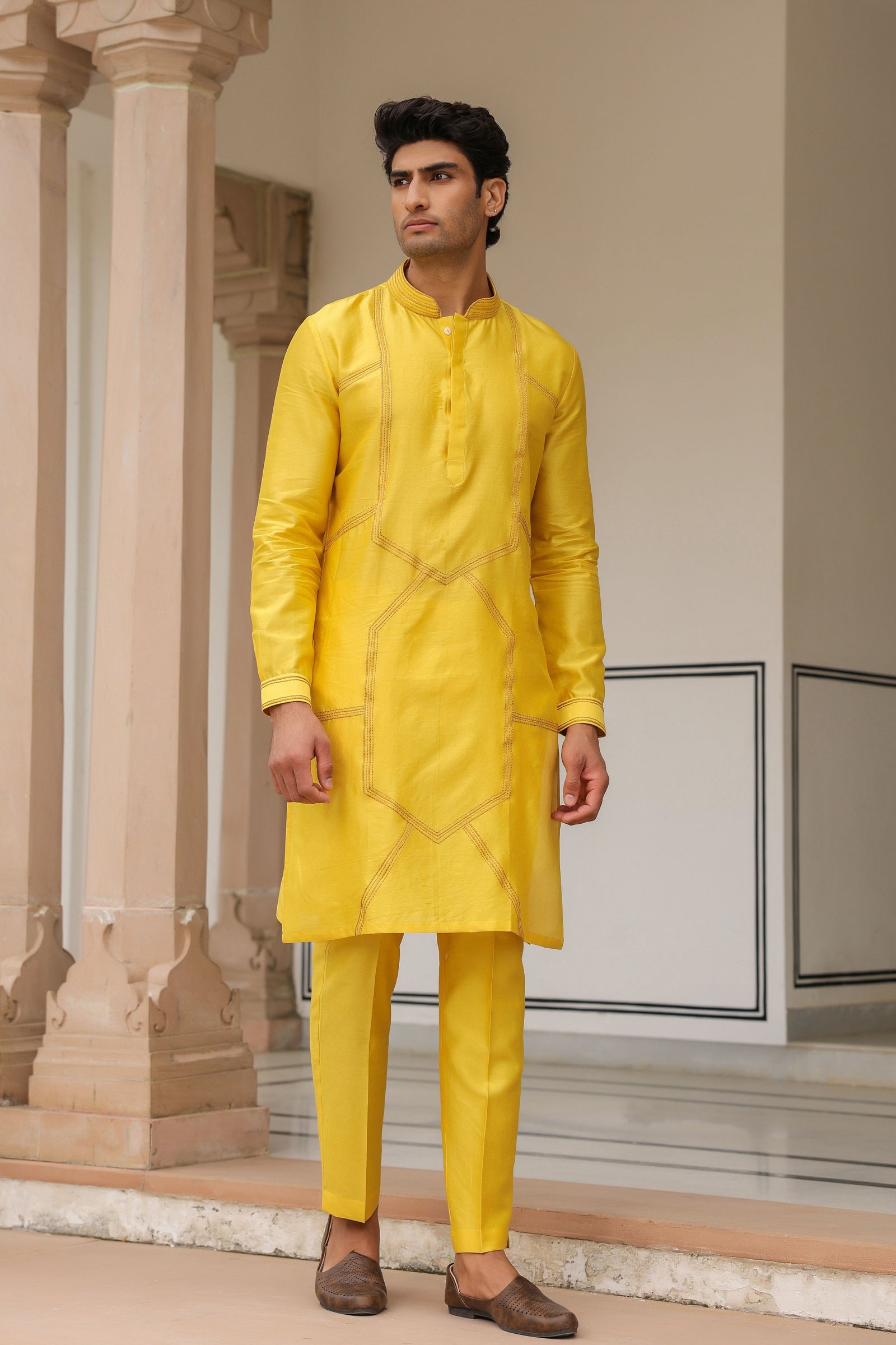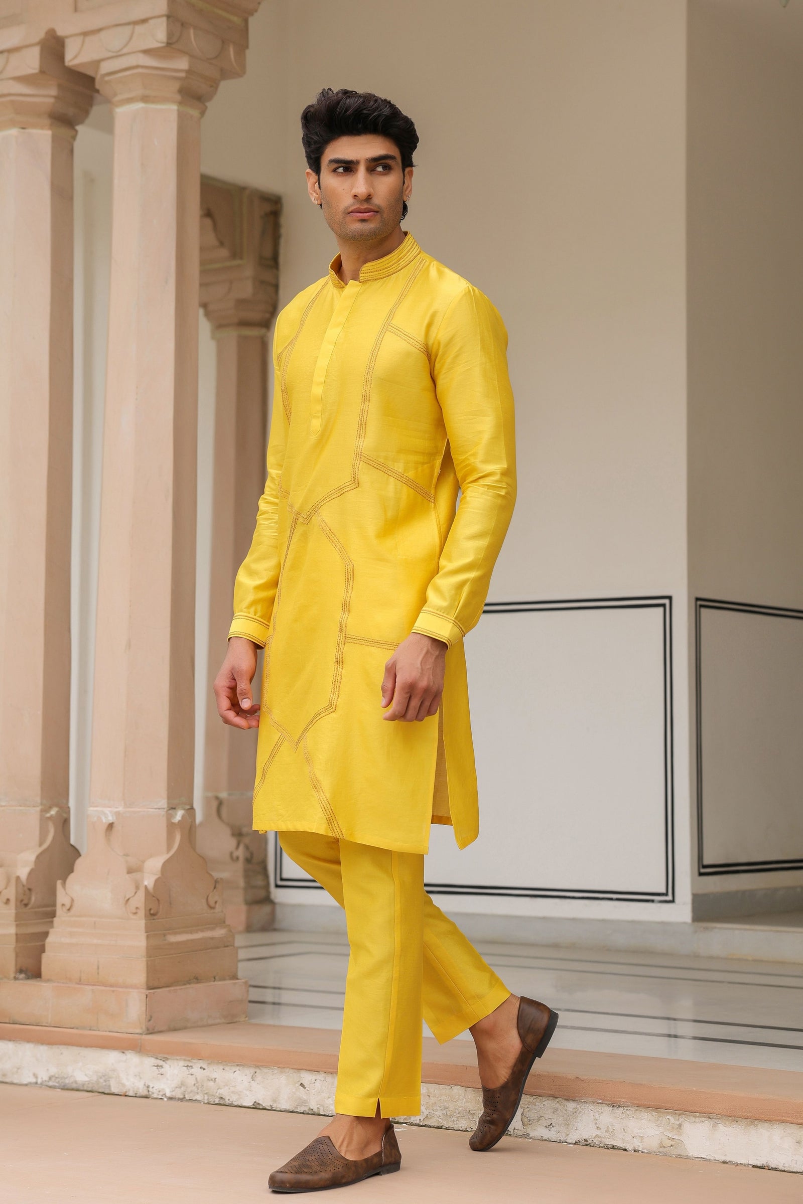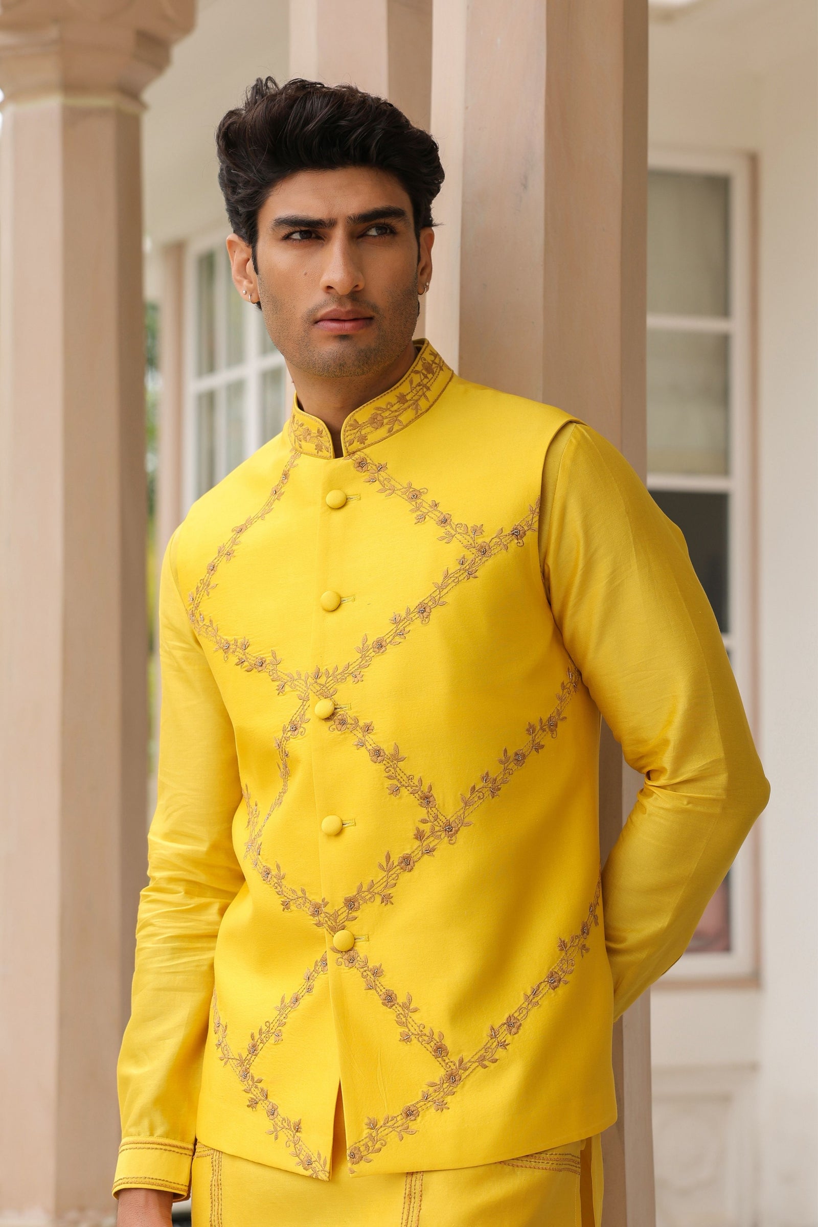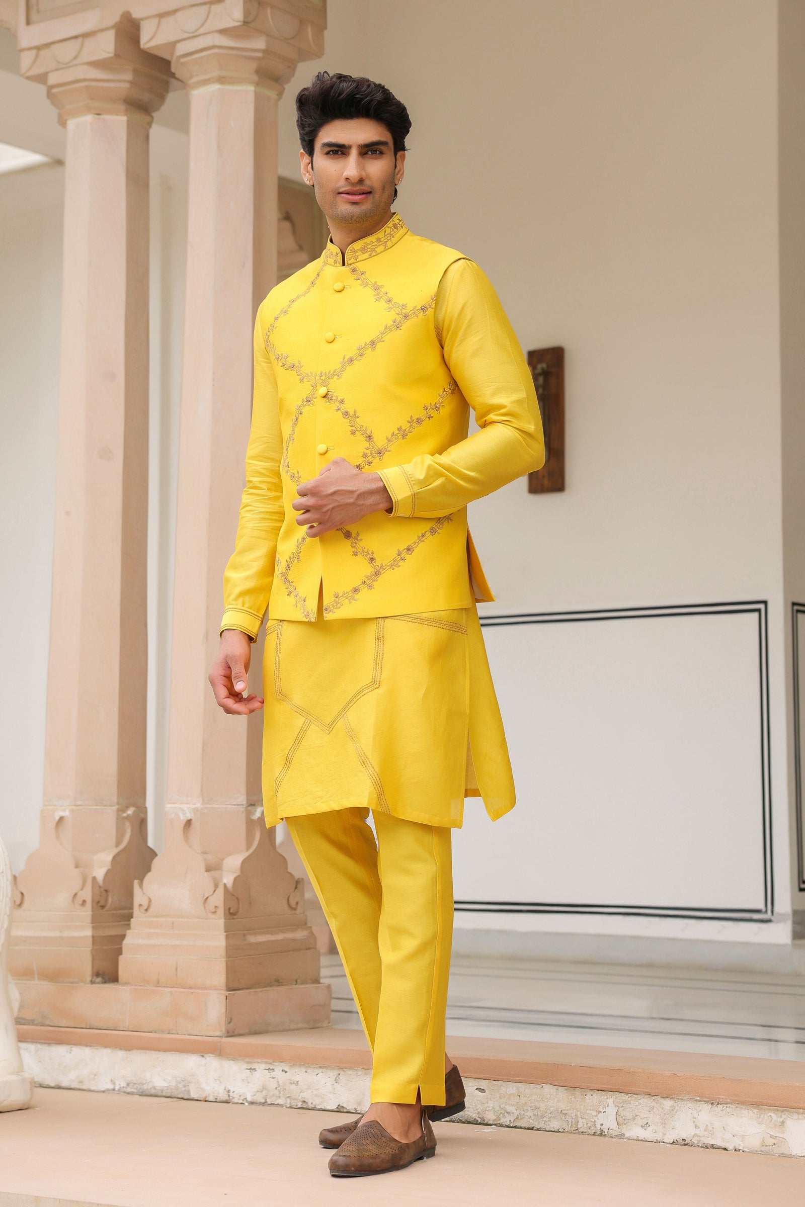 • Bandi and Kurta set can be sold seperately. Check out Gulzar Yellow Floral Geometric Bandi, Gulzar Yellow Kurta Set