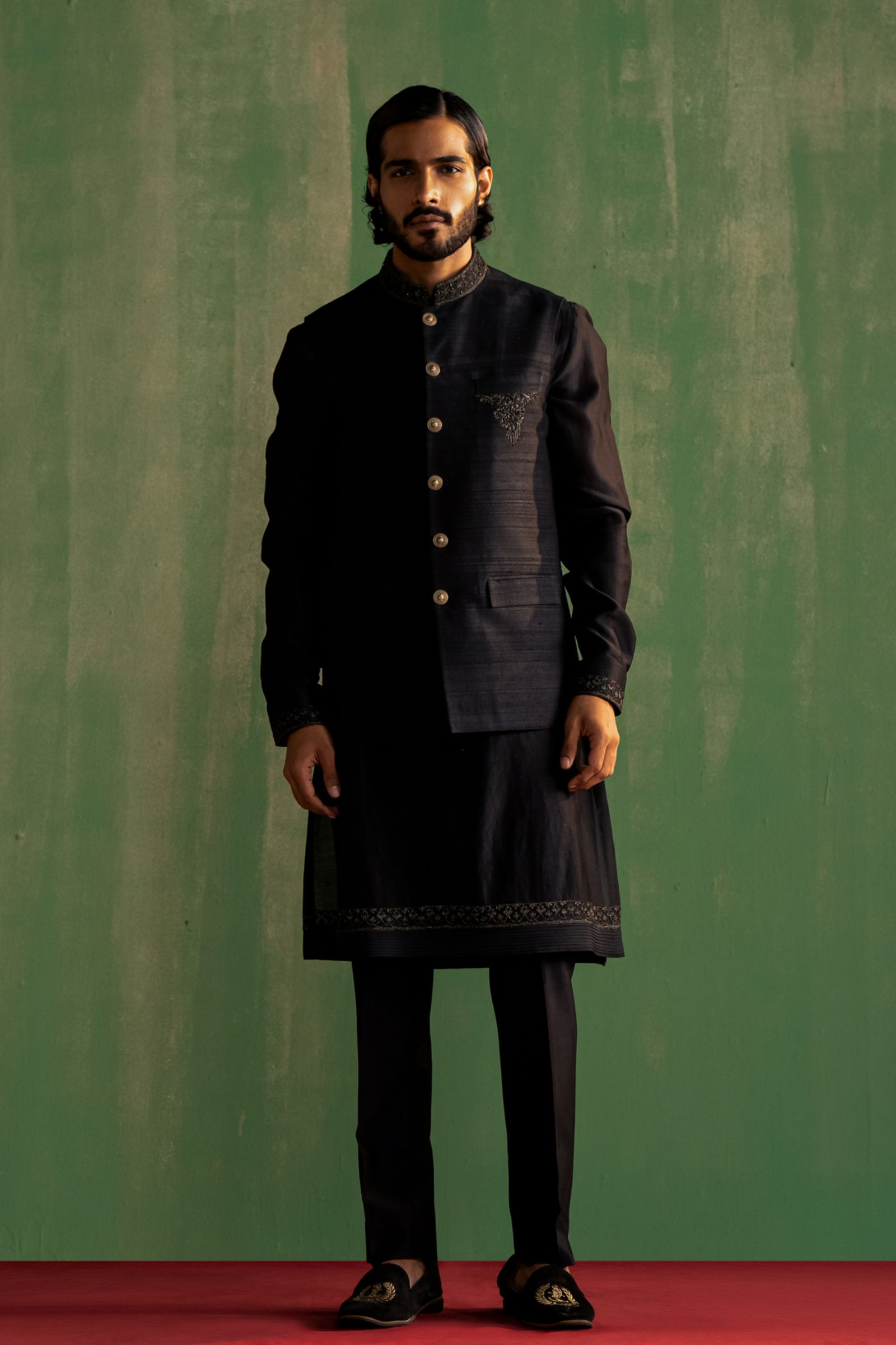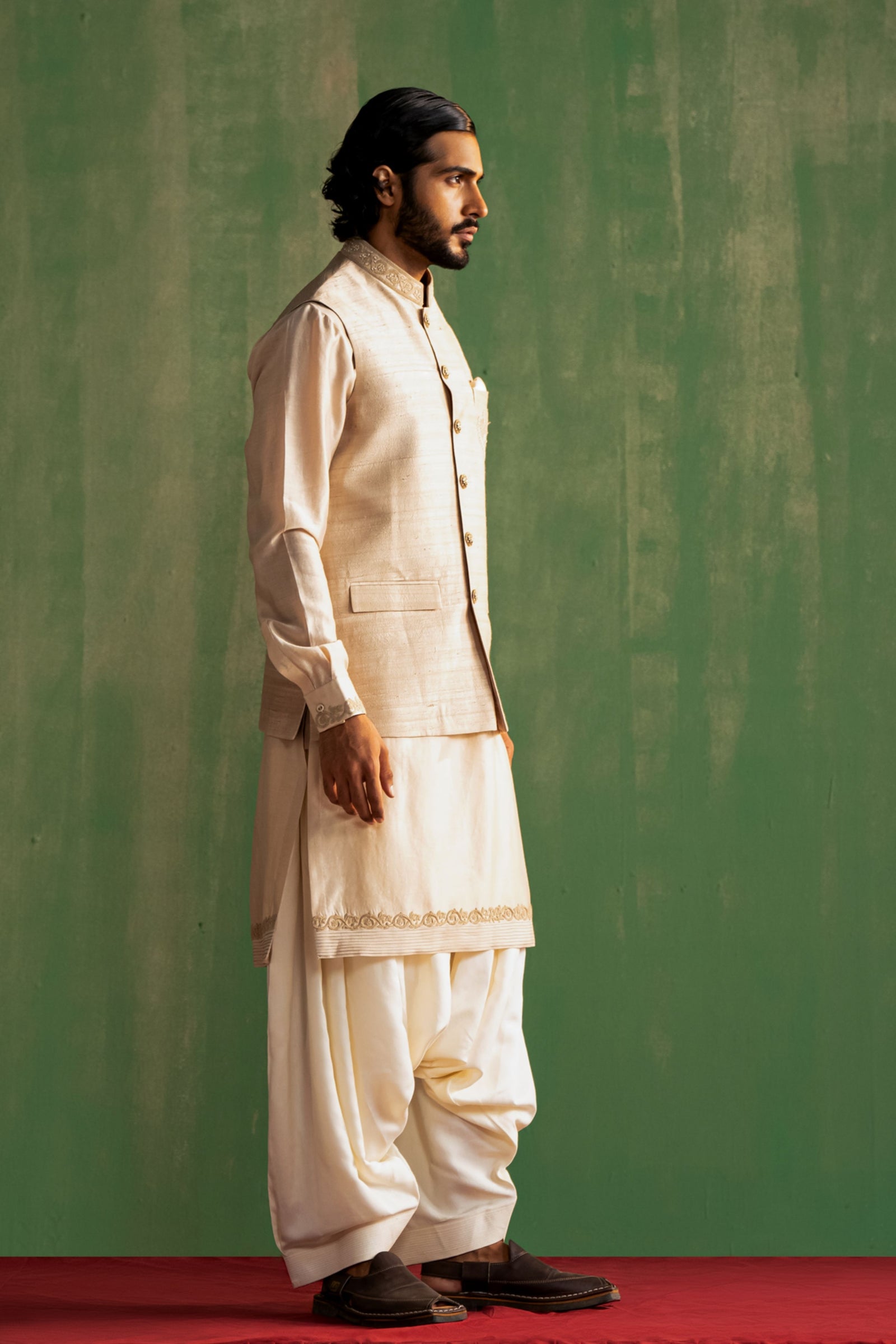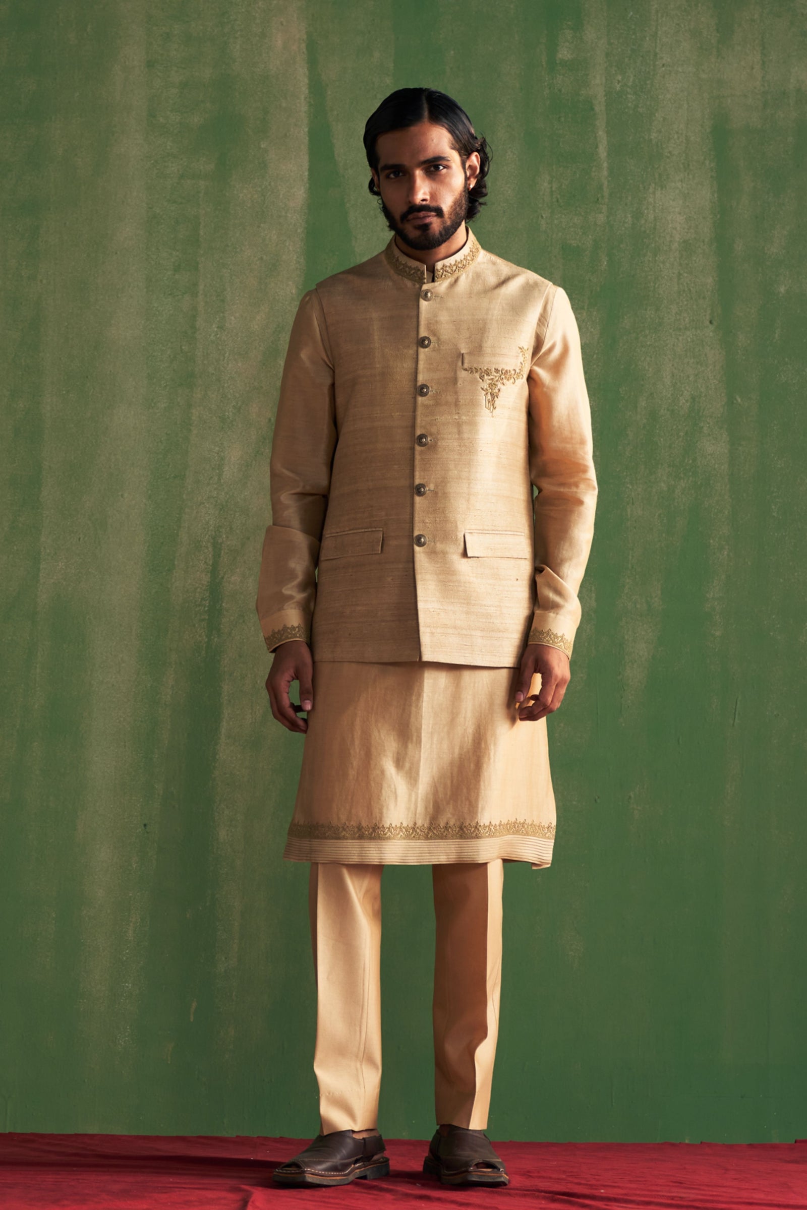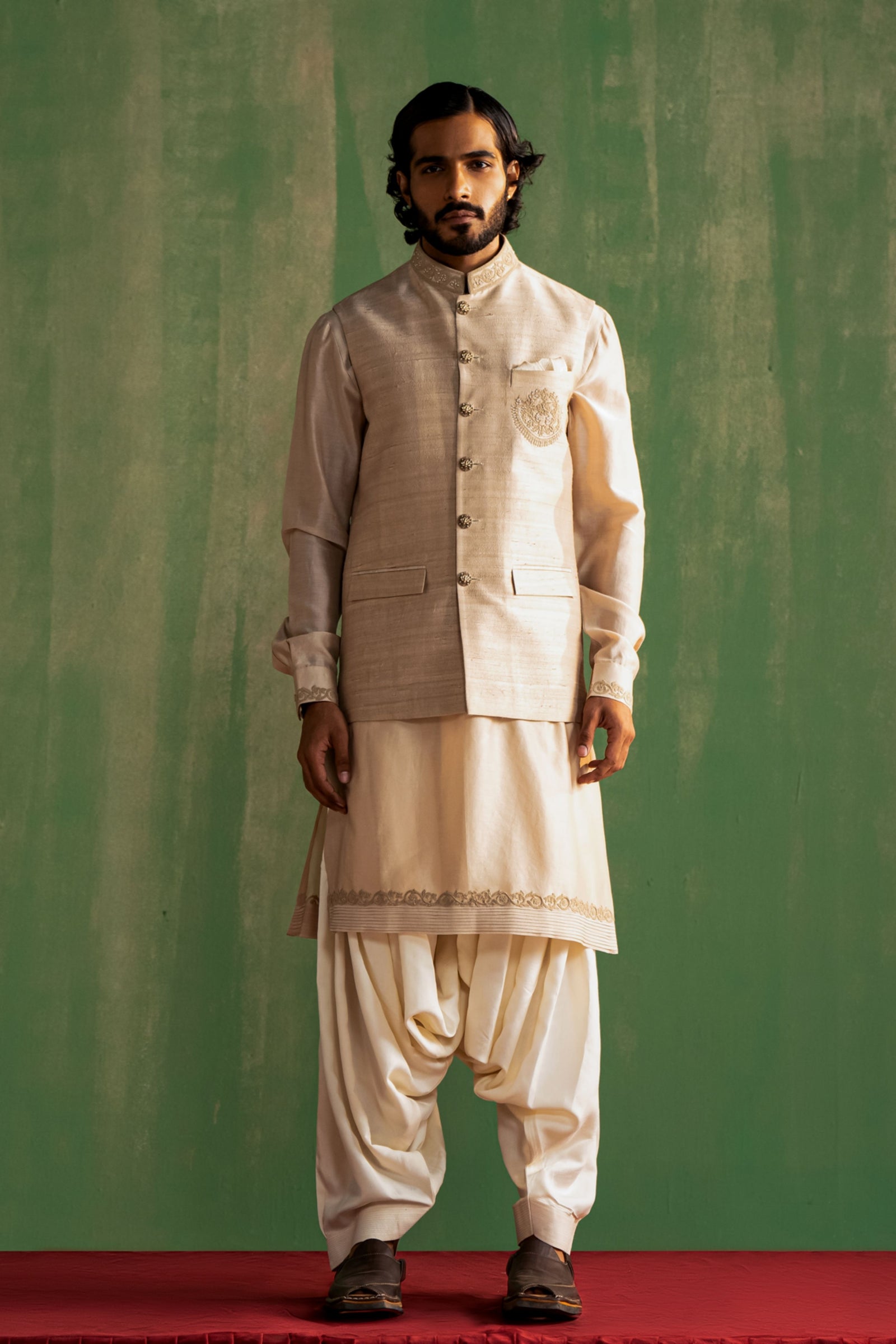 • This set comprises a bundi, kurta, and pants. The bundi showcases detailed dori embroidery on the collar and pocket flaps. The kurta features intricate dori embroidery on the cuffs, paired with straight pants
