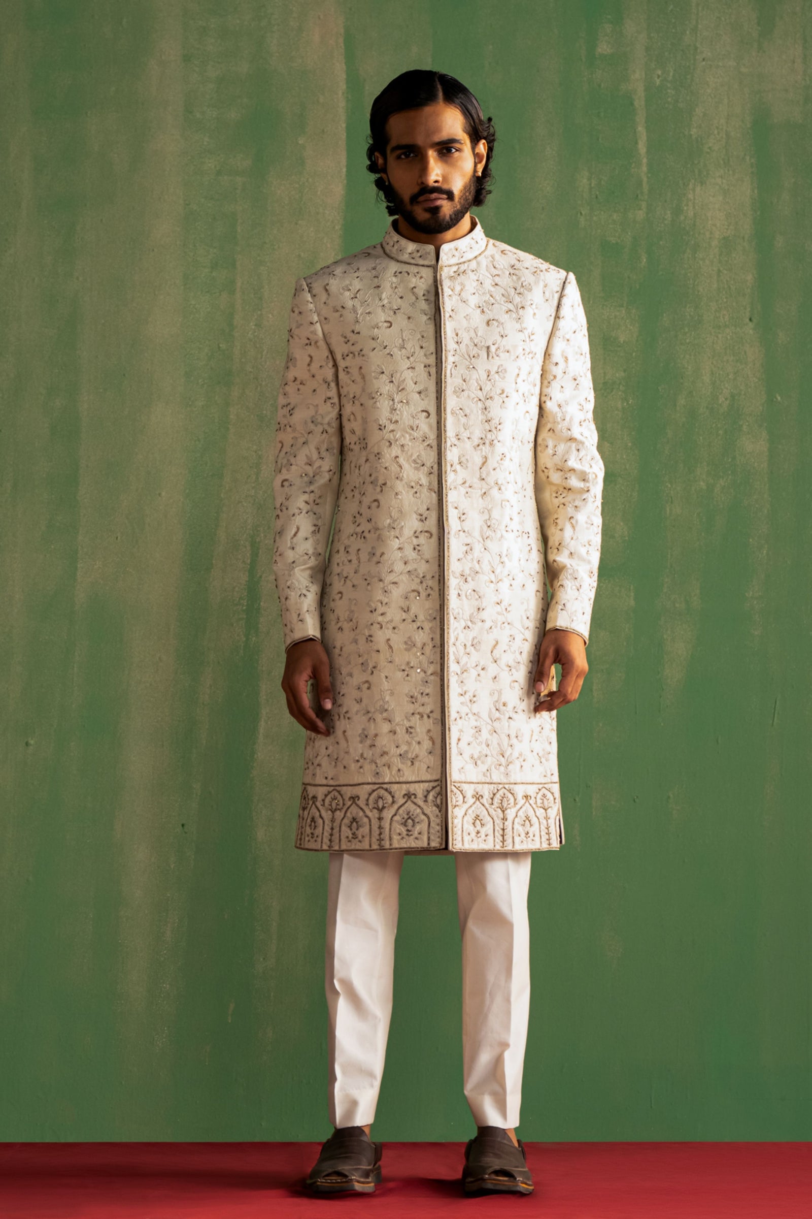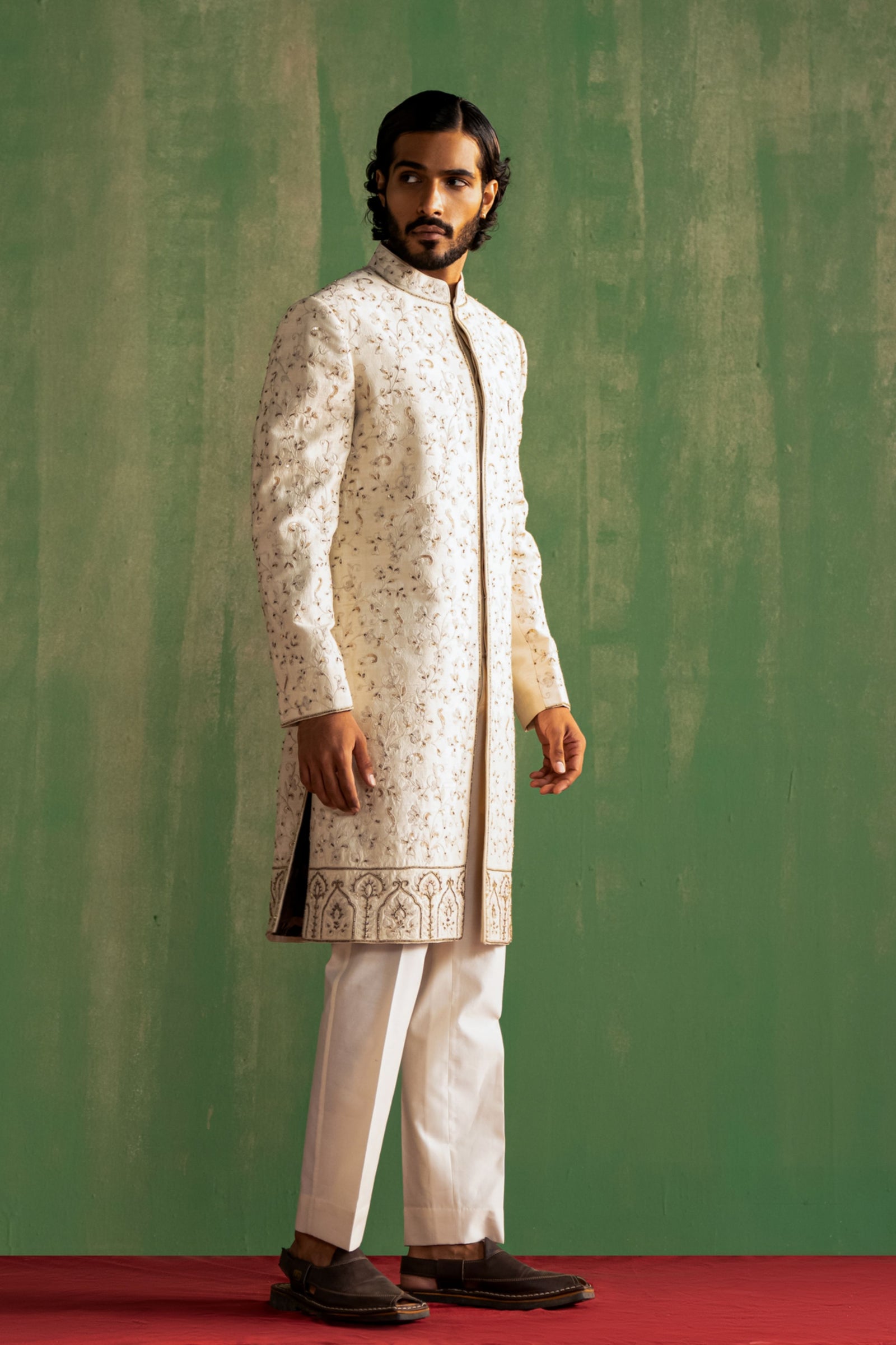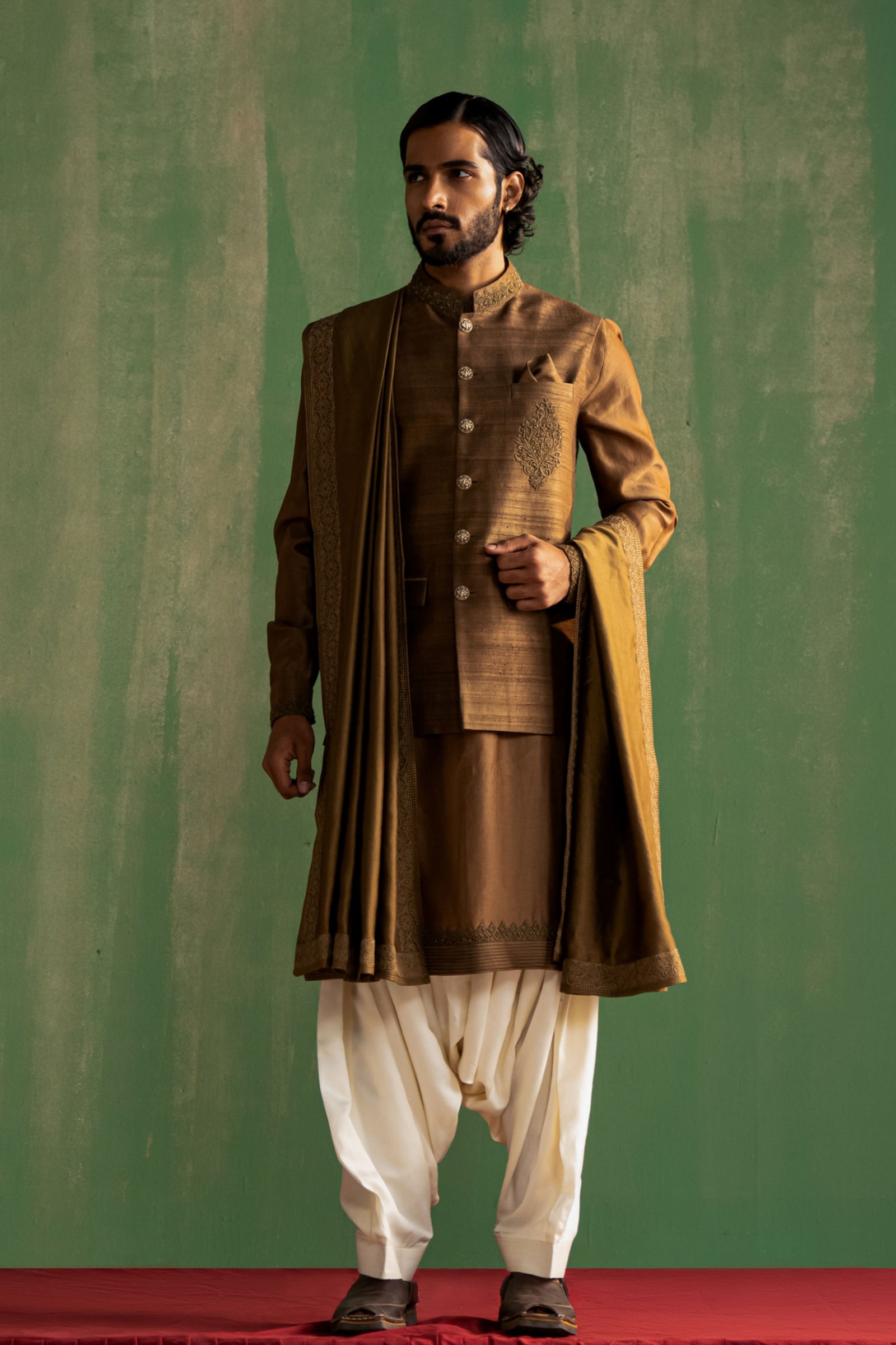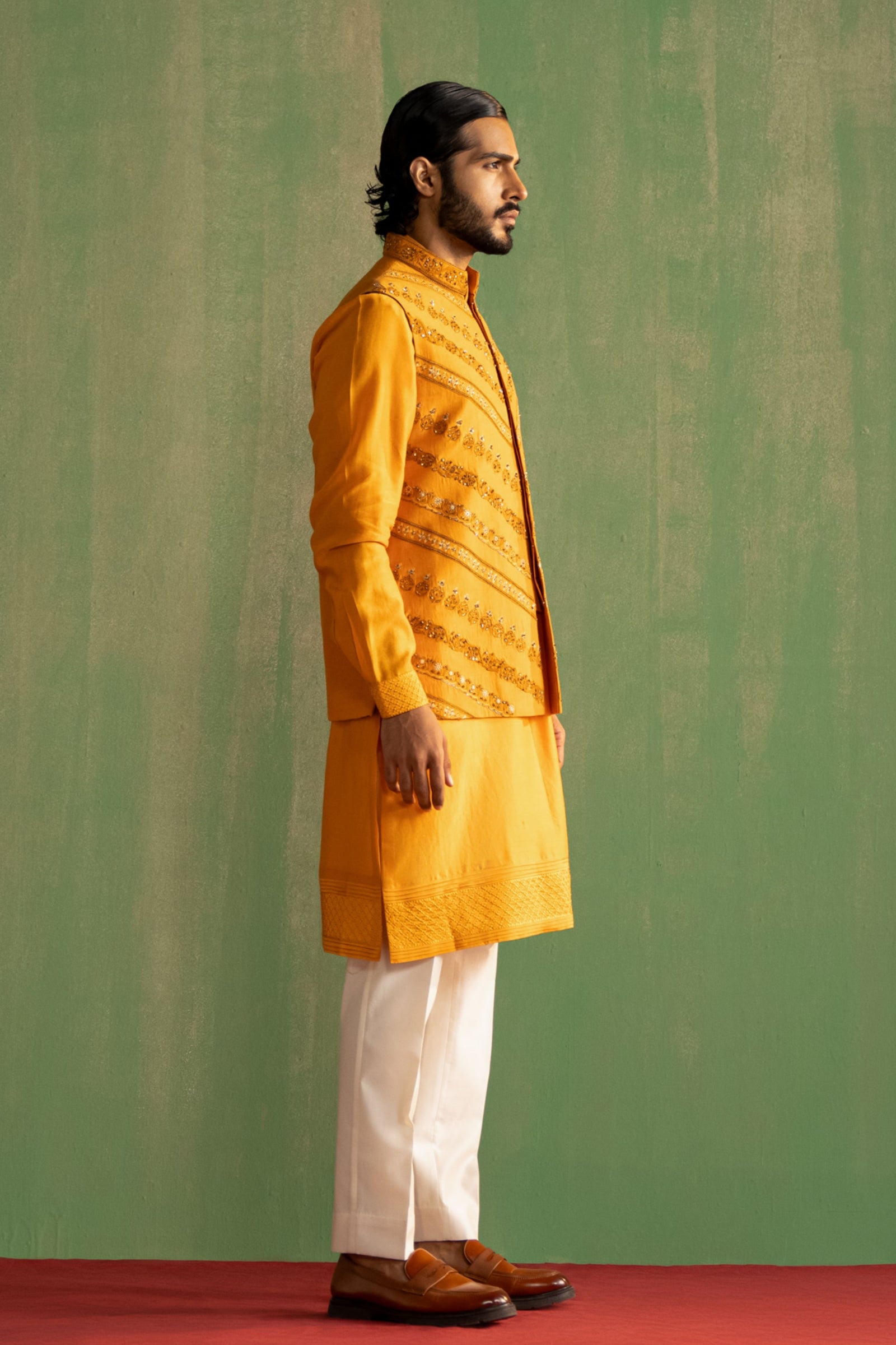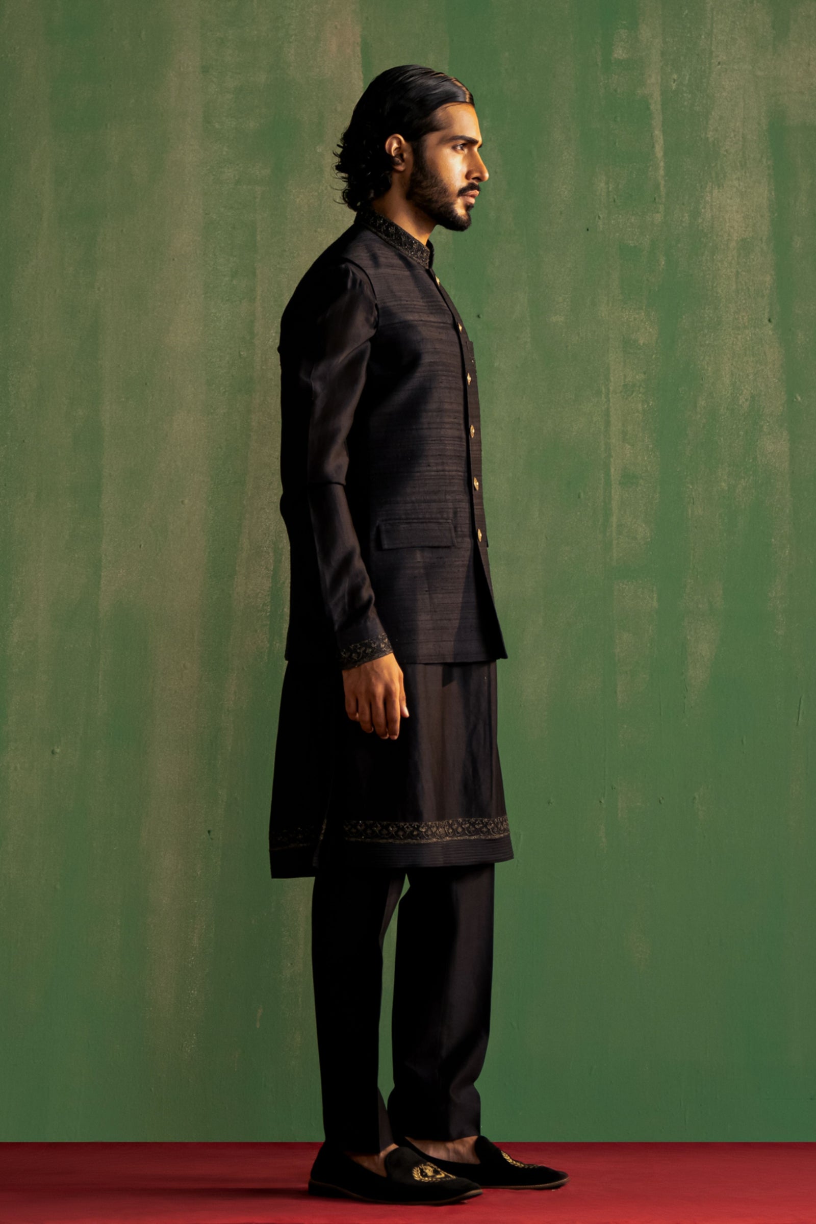 • This set comprises a bundi, kurta, and pants. The bundi showcases detailed dori embroidery on the collar and pocket flaps. The kurta features intricate dori embroidery on the cuffs, paired with straight pants
