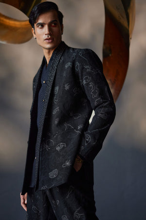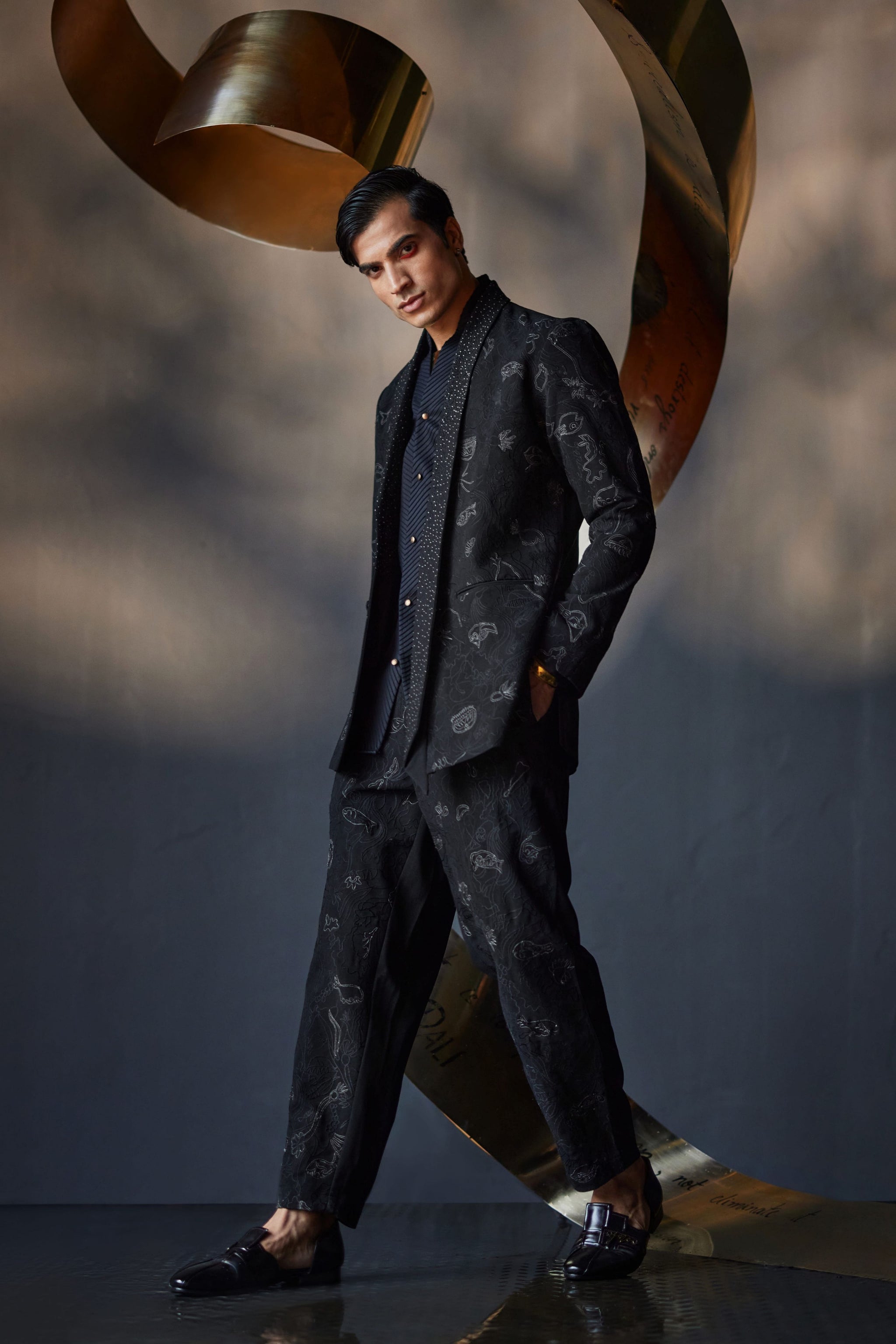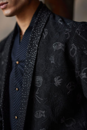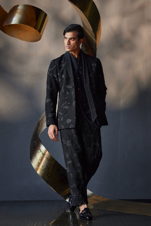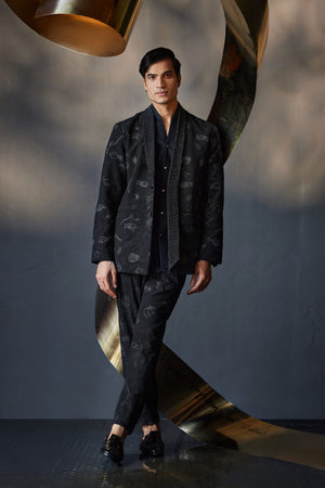 • This sleek black blazer set features intricate motifs inspired by dali's artworks. This blazer is a tribute to the enchanting world of dali, a symphony of his surreal creations woven into every thread. Paired with a matching embroidered jogger and pintuck detailed shirt with gold button detailing.