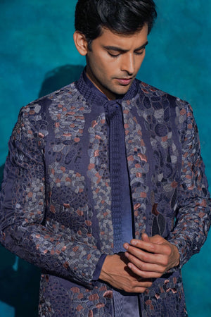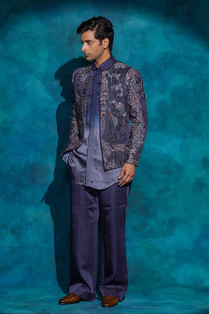 • Presenting our short jacket set in a striking oceanic purple hue. Hand-embroidered to perfection by skilled artisans using aari and zardozi techniques with resham and moti, this piece is inspired by shiva as pashupatinath, the eternal guardian of all living beings. Celebrating protection, strength, and compassion, the intricate embroidery reflects the divine balance between nature and divinity. Paired with an ombre kurta and straight trousers, this ensemble is both elegant and meaningful.