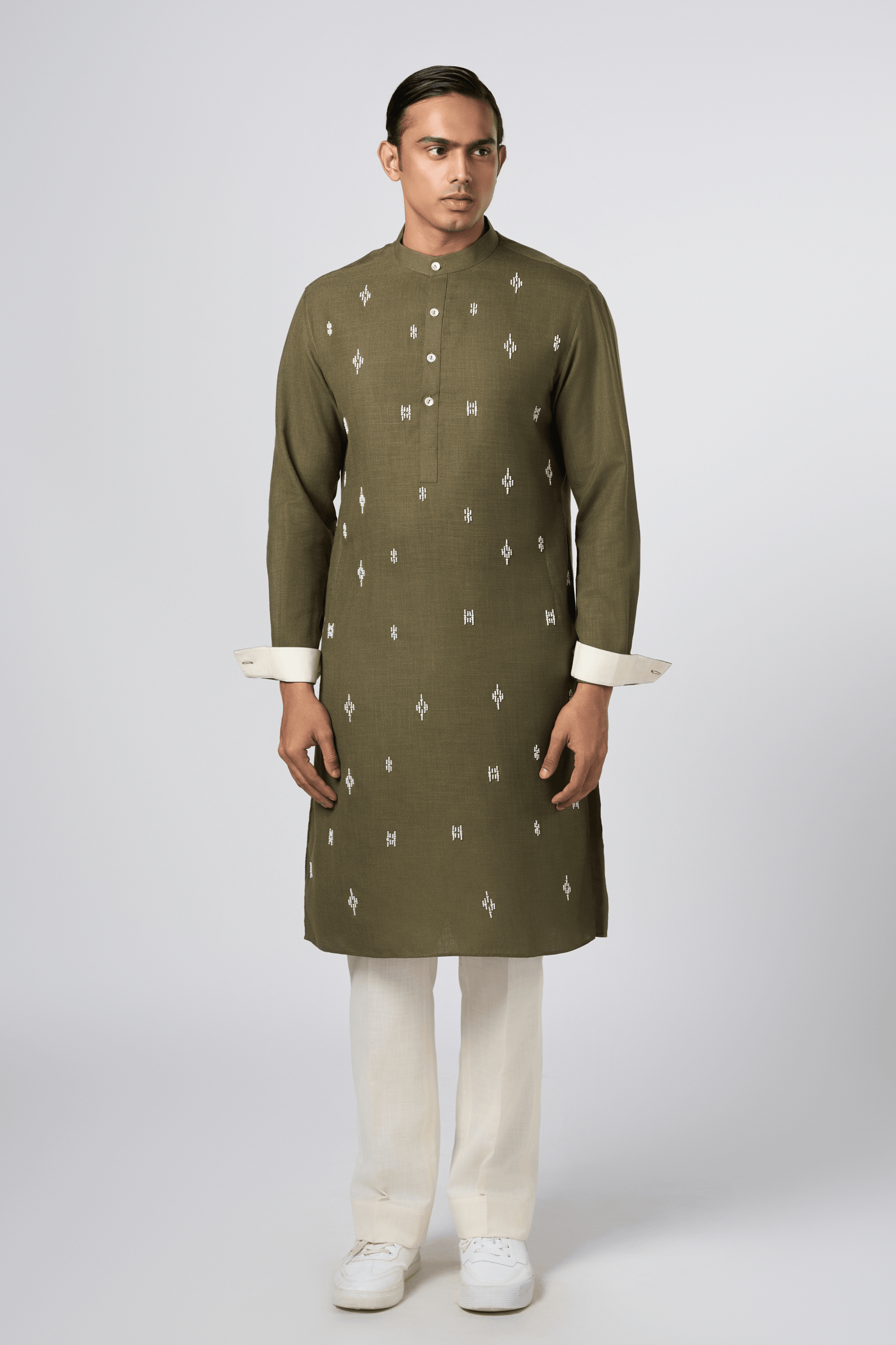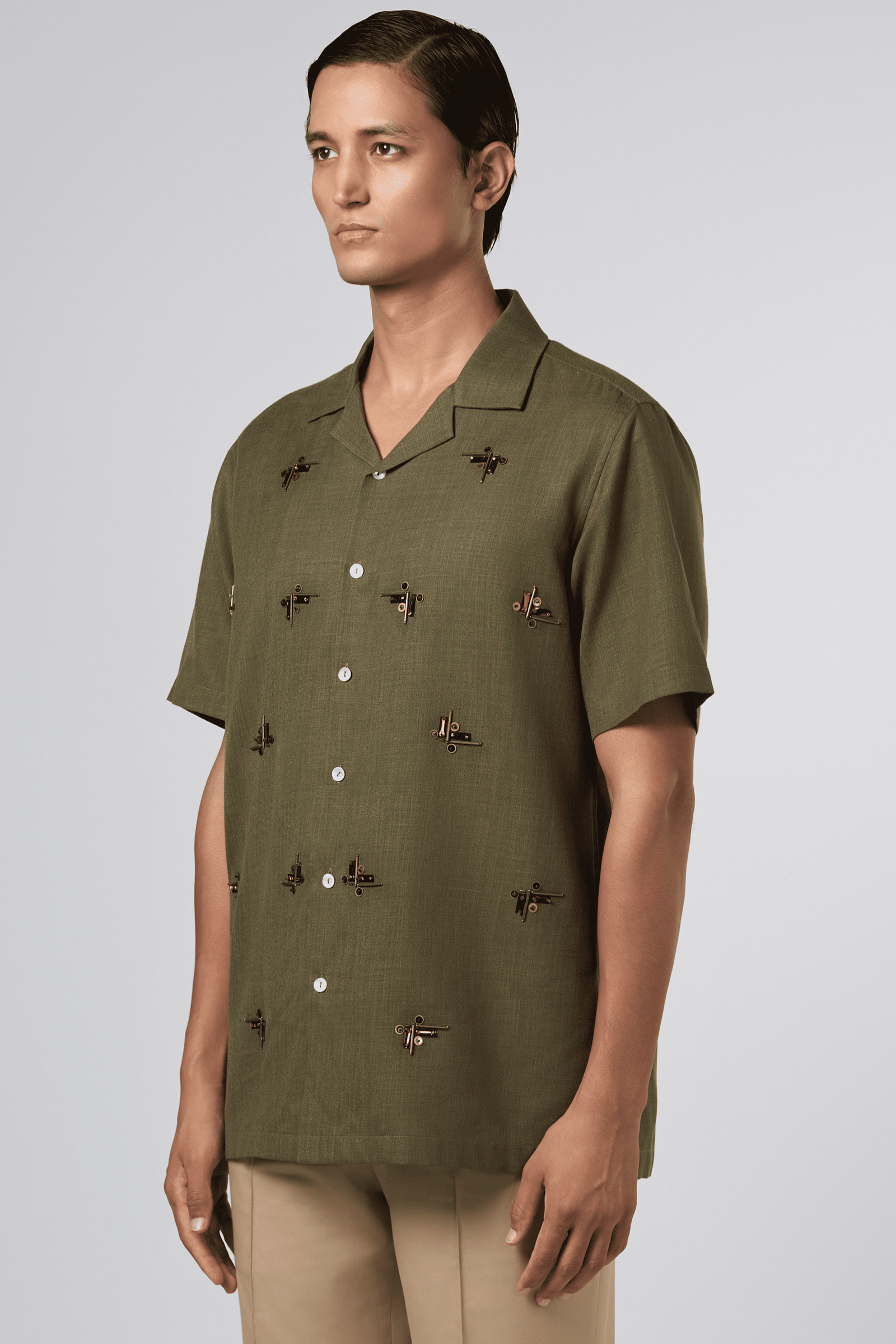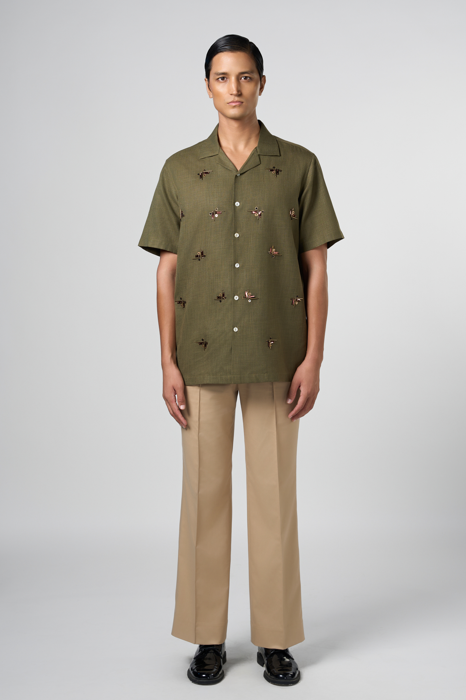 • Off white straps with olive green stitch line detail stitched upon olive green full sleeved button down shirt